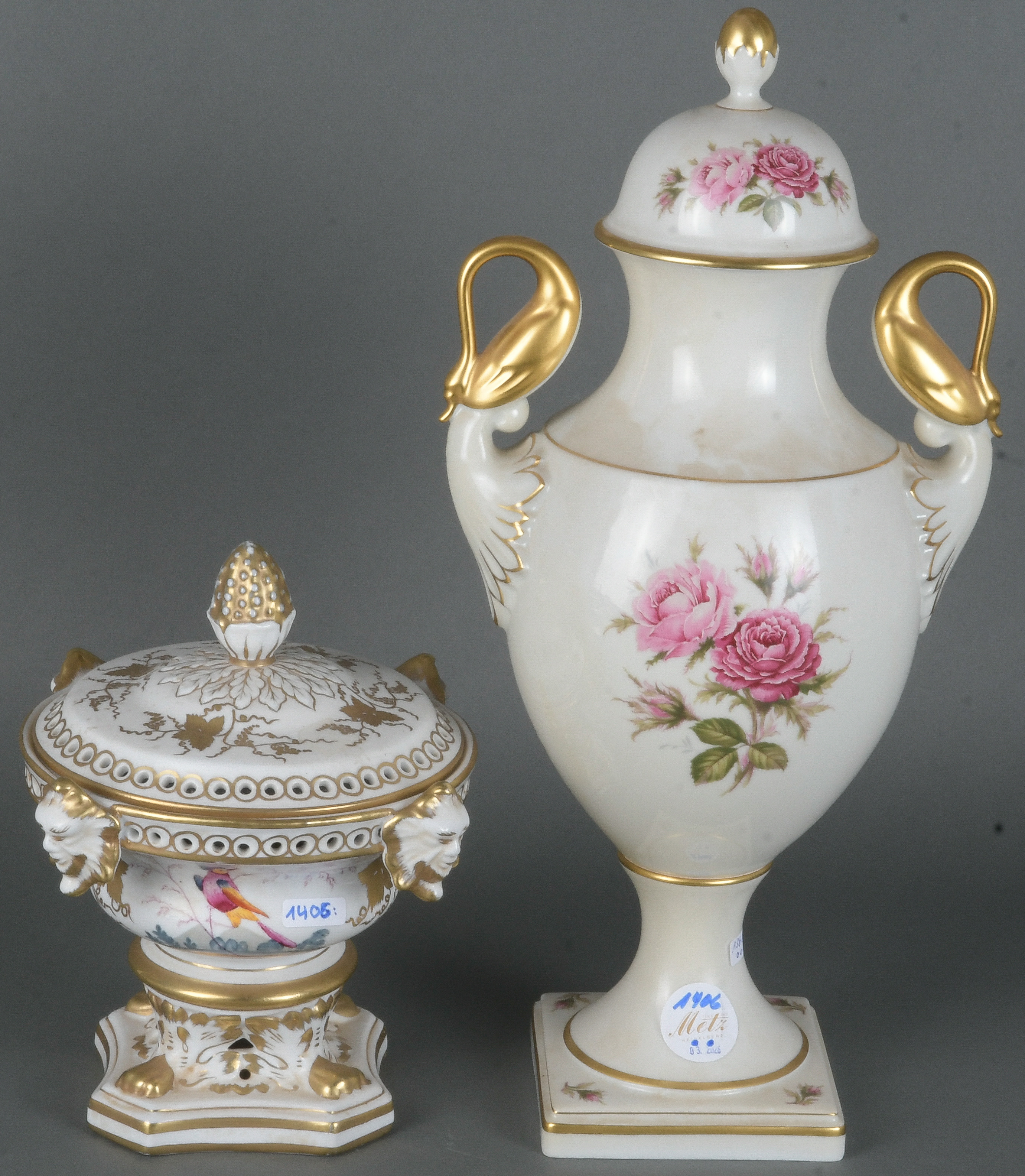 - Katalog-Nr: 1406Potpourrivase. Dresden 19. Jh. Porzellan, bunt bemalt mit Vogeldekor, reich gold dekoriert (H=21,5 cm, D=20 cm); dazu Doppelhenkelvase. Kaiser 20. Jh. Porzellan, bunt bemalt mit roter Rose; am Boden gemarkt, H=41 cm.o.L.