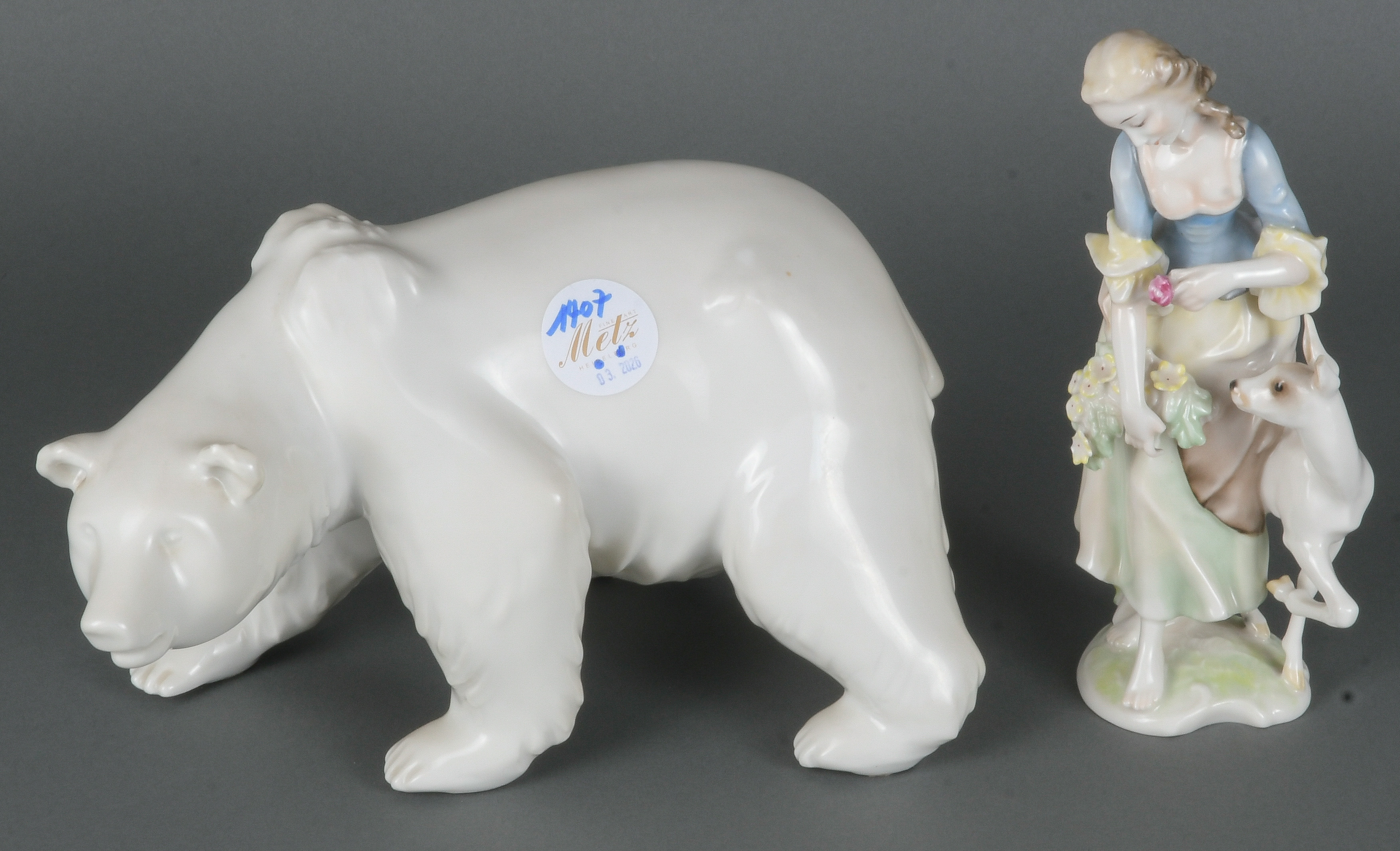- Katalog-Nr: 1407Eisbär. Berlin 19. Jh. Porzellan, weiß glasiert, am Bauch unterglasurblaue Szeptermarke (H=15 cm); dazu weibl. Figur mit Reh. Hutschenreuther 20. Jh. Porzellan, bunt bemalt; H=20,5 cm.o.L.