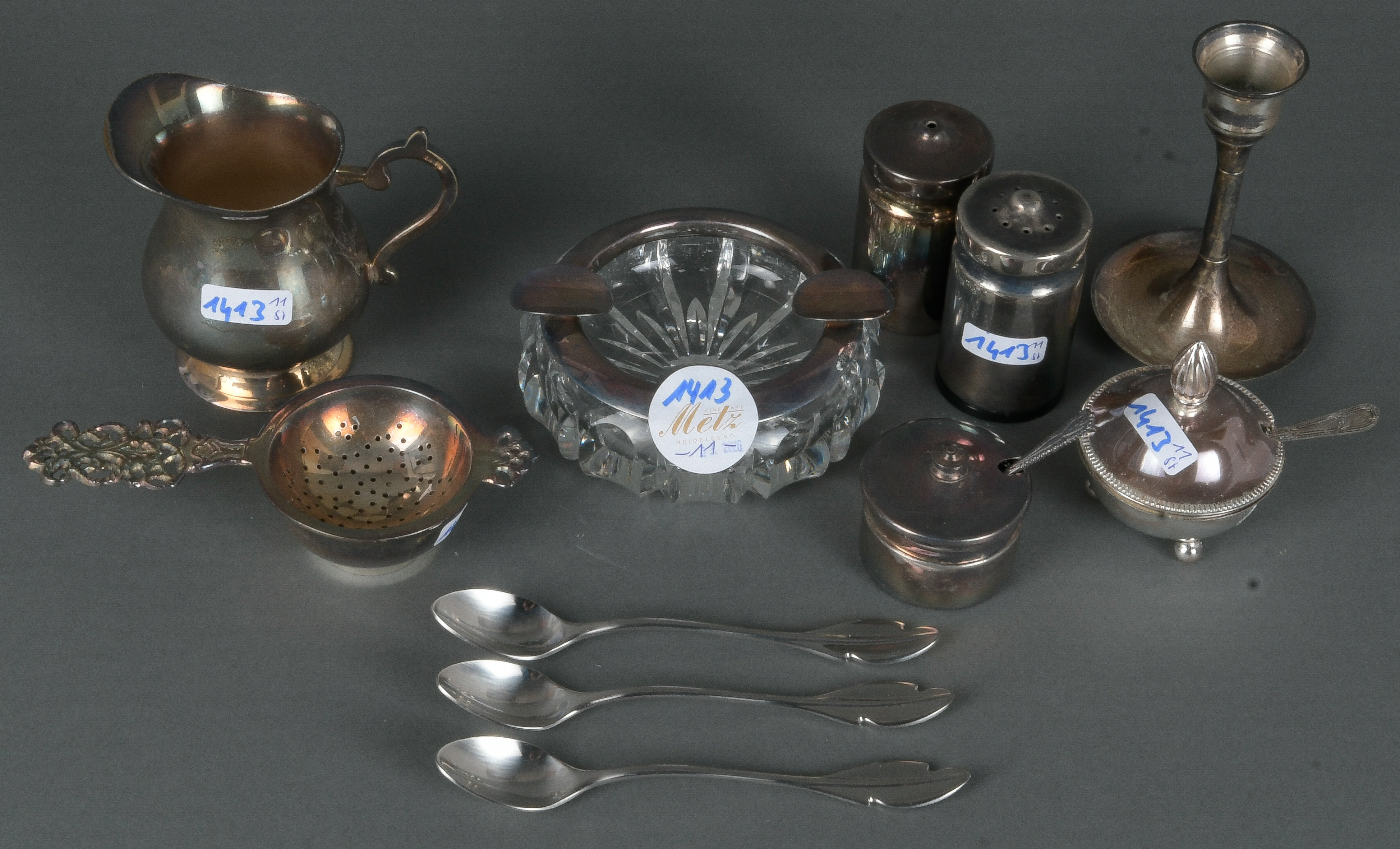- Katalog-Nr: 1413Zehntlgs. Konvolut Versilbertes u.a. Kerzenständer, Löffel, Milchgießer, Salz- und Pfefferstreuer und Teesieb (H=3 bis 10,5 cm); dazu Kristallglas-Aschenbecher mit 835er Silbermontur, D=10,5 cm.o.L.