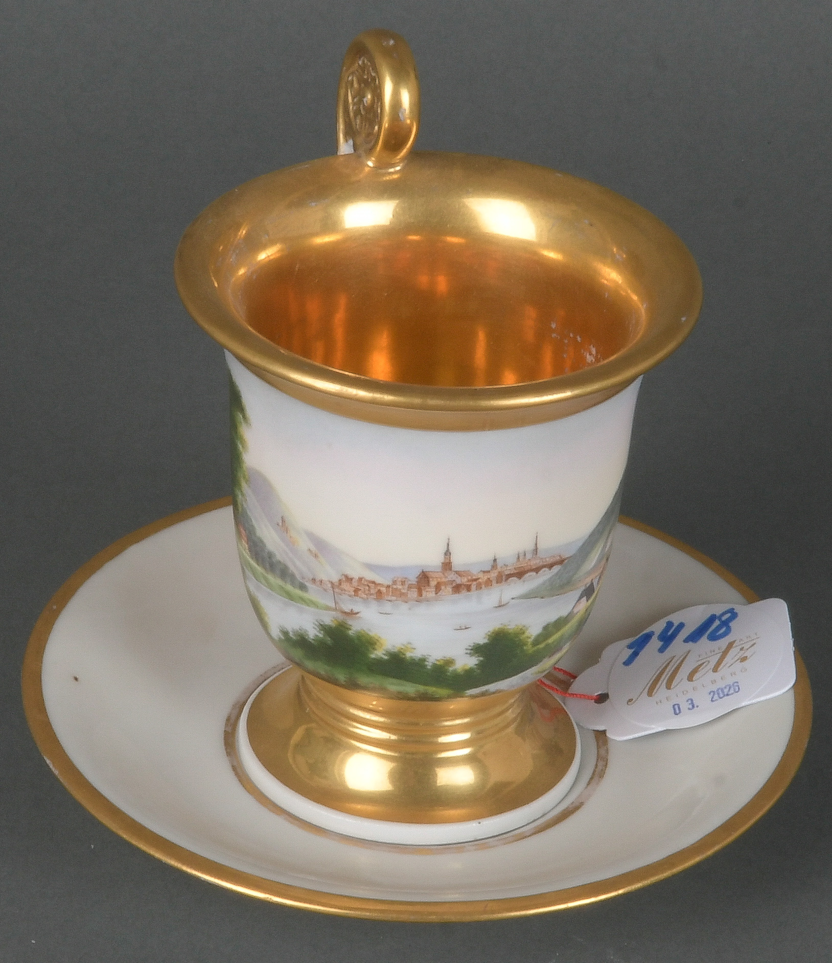 - Katalog-Nr: 1418Ansichtstasse „Heidelberg“. Deutsch 19. Jh. Porzellan, bunt bemalt, beschriftet und reich gold dekoriert; ohne Marke.o.L.