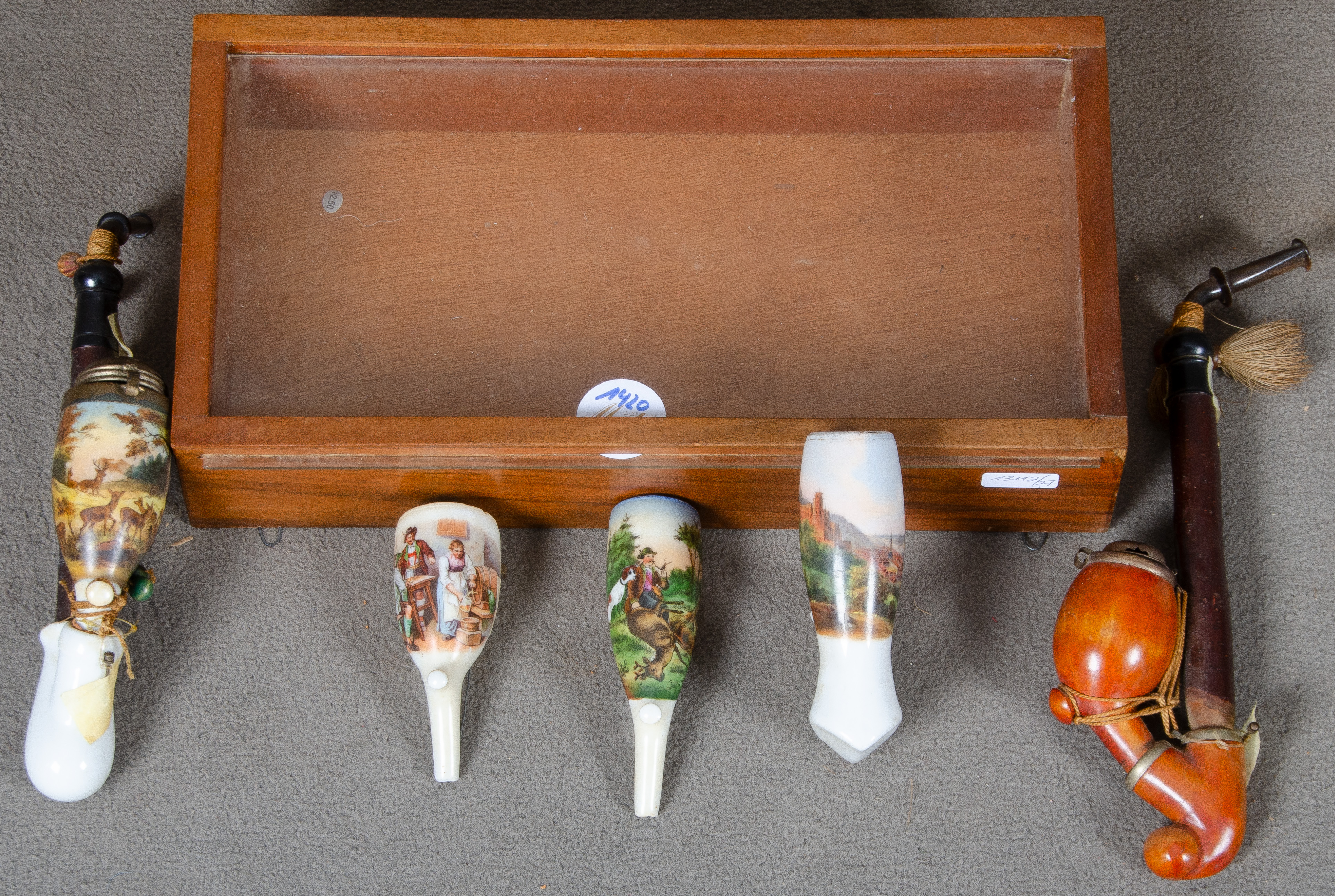 - Katalog-Nr: 1420Konvolut Pfeifen und -köpfe. Deutsch um 1900. Porzellan, dekoriert mit Jagdmotiv, Heidelberger Ansicht und Interieur, L=8,5 bis 24 cm.o.L.