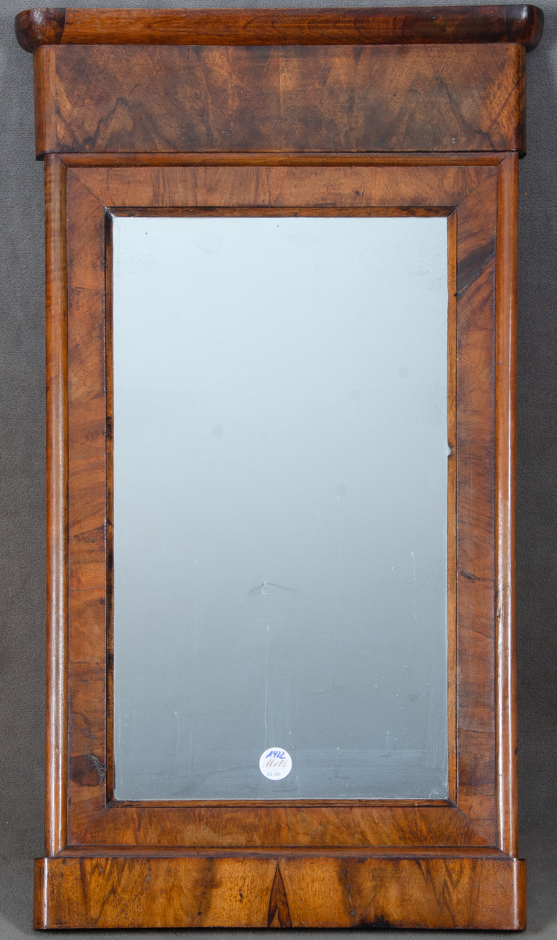 - Katalog-Nr: 1422Biedermeier-Spiegel. Deutsch 19. Jh. Nussbaum furniert, teilw. massiv, 84 x 47 cm.o.L.