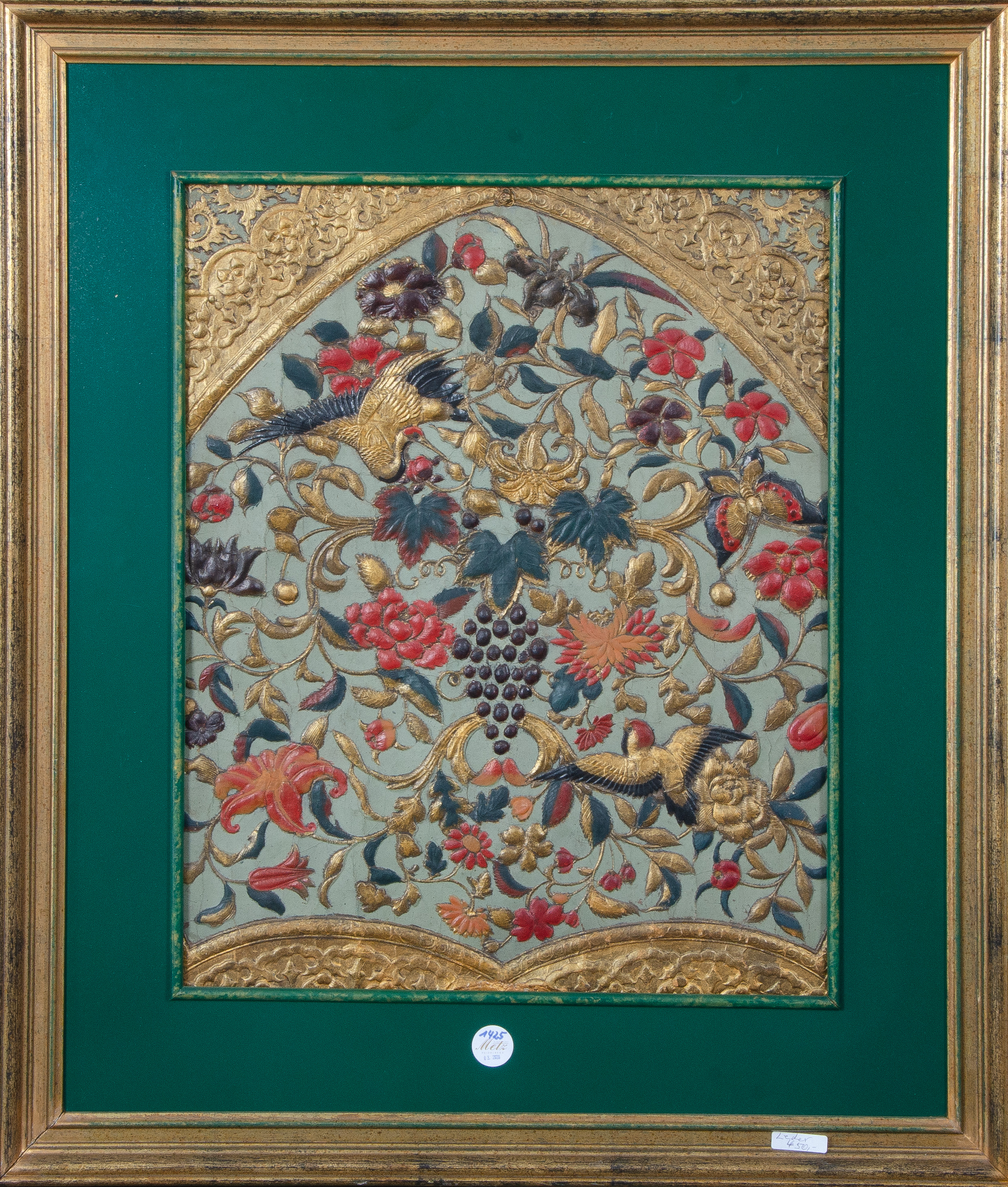 - Katalog-Nr: 1425Lederprägung im Rahmen. Asien. Mit Blumen-, Früchten- und Vogeldekor, bunt und gold bemalt, 59 x 47 cmo.L.