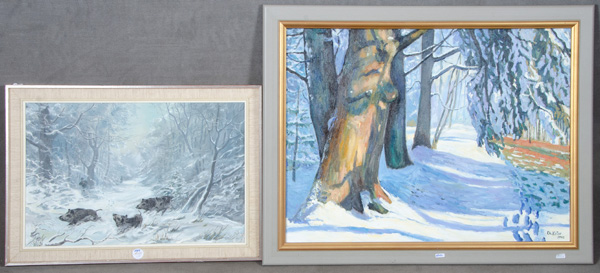 - Katalog-Nr: 1419Ch. Keller (Maler des 20./21. Jhs.). Winterlandschaft mit Bäumen. Öl/Lw., re./u./sign./dat. 2003; dazu F. Stoll (Maler des 20. Jhs.). Saujagd. Öl/Malkarton, re./u./sign./dat. (19)68, gerahm, 39 x 59 / 59 x 79 cm.o.L.