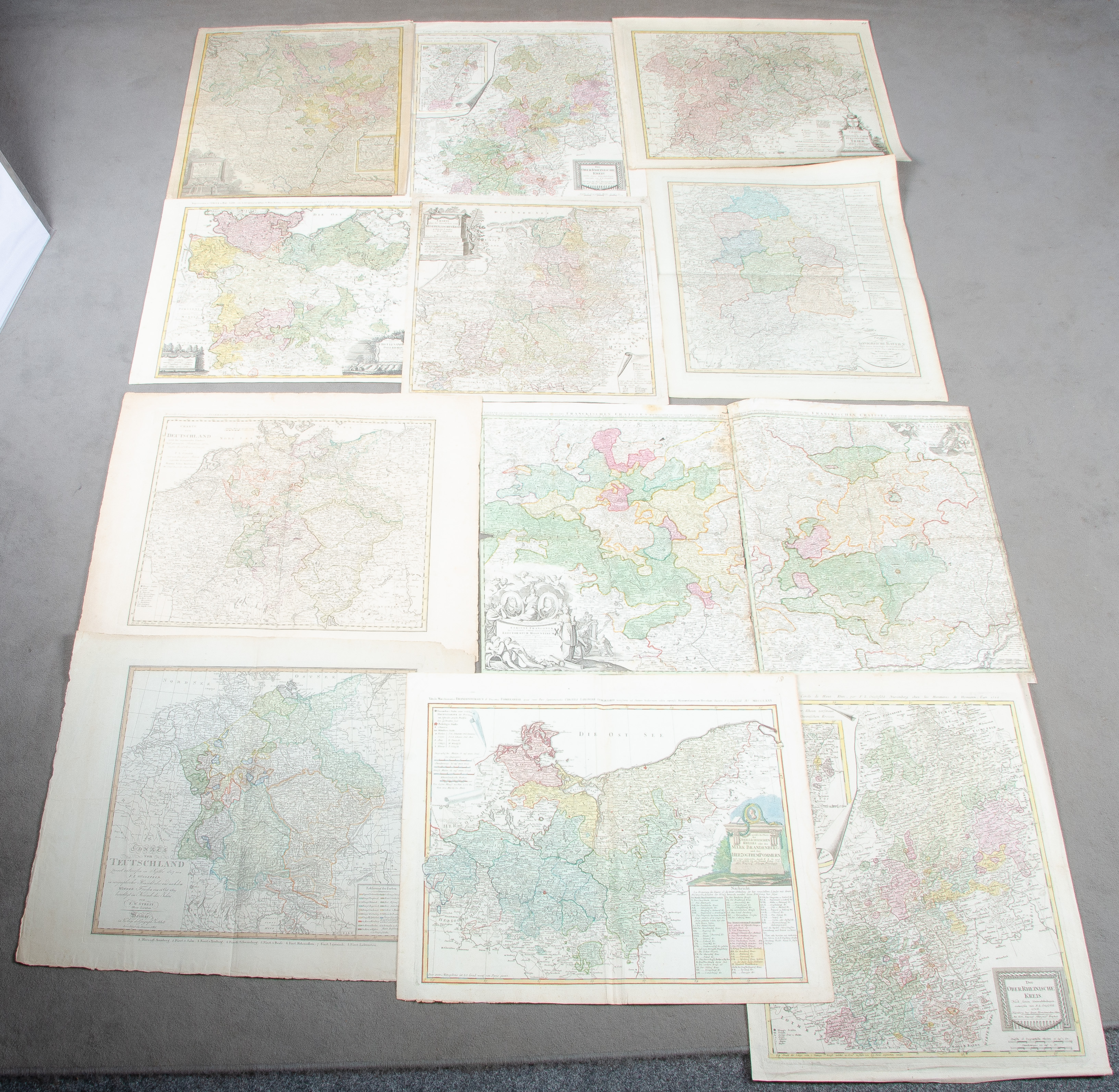 - Katalog-Nr: 1451Johann Baptista Homann (1664-1724) / Franz Ludwig Güssefeld (1744-1808) / Homann'sche Erben u.a. Neun Karten (eine in vier Teilen): Königreich Bayern, Franken, westphälischer Kreis, niedersächsischer Reichskreis, oberrheinischer Kreis, Fürstentum Trier, Rheingebiet, Rhein, Maas und Mosel, Ostsee. Colorierte Kupferstiche, teilw. mit Wappenkartusche, teilw. sign./dat., 46 x 49 bis 55 x 94 cm.o.L.
