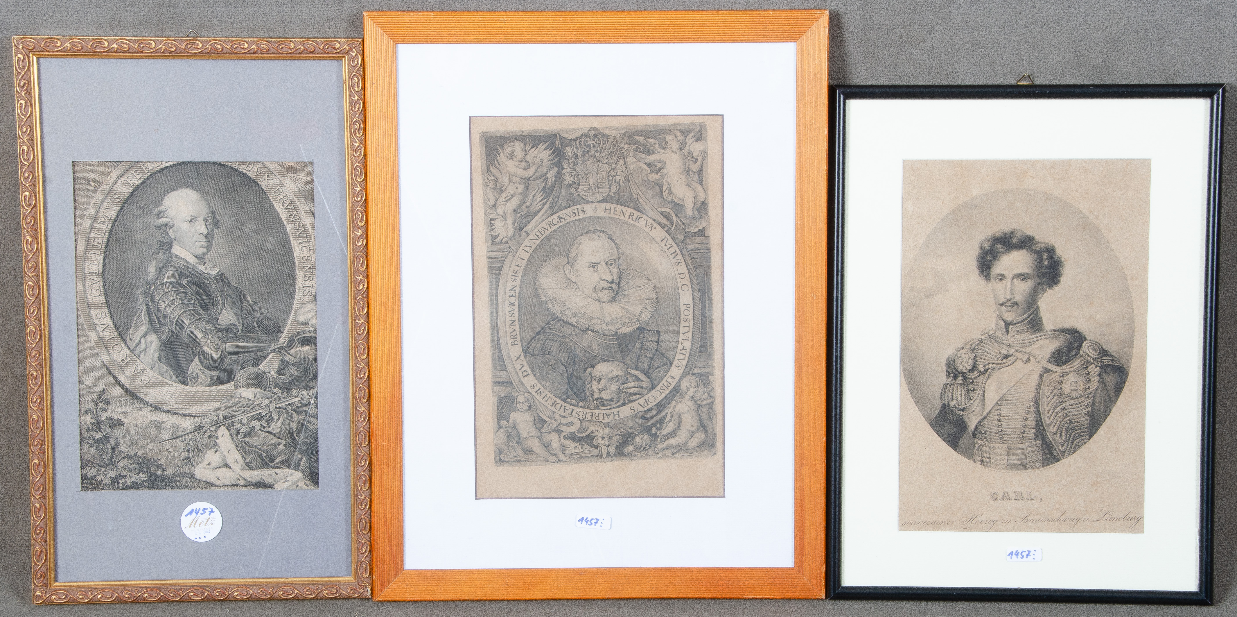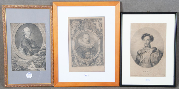- Katalog-Nr: 1457Graphiker des 18./19. Jhs. Porträt von Carl von Braunschweig, Ferdinand von Braunschweig und Heinrich Julius von Braunschweig-Wolfenbüttel. Zwei Kupferstiche und eine Lithograhie, mit Passepartout hi./Gl. gerahmt, 27 x 18 bis 28 x 18 cm.o.L.