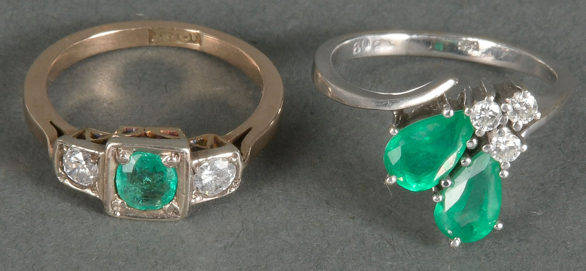 - Katalog-Nr: 1471Zwei Damenringe: 14 kt Gold, besetzt mit zwei Smaragddoubletten und drei Brillanten, ca. 0,08 ct, Gesamtgewicht ca. 3,2 g, Ringgröße 51; 18 kt Gold, besetzt mit einem Smaragd und zwei Brillanten, ca. 0,20 ct, Gesamtgewicht 2,7 g, Ringgröße 49. Die Begutachtungen der verarbeiteten Edelsteine und Diamanten wurden im gefassten Zustand vorgenommen, d.h. unter Vorbehalt einer sachgerechten Graduierung, die nur an ungefassten Steinen erfolgen kann. Dies hat zur Folge, dass die Gewichte (sog. "berechnete Gewichte", d.h. ca.+/- 10 % Abweichung) und Qualitäten (Farbe, Reinheit und Schliff) der Steine nur annähernd angegeben werden können.o.L.