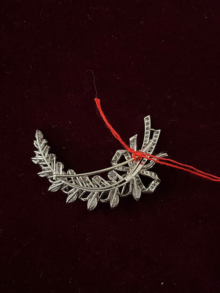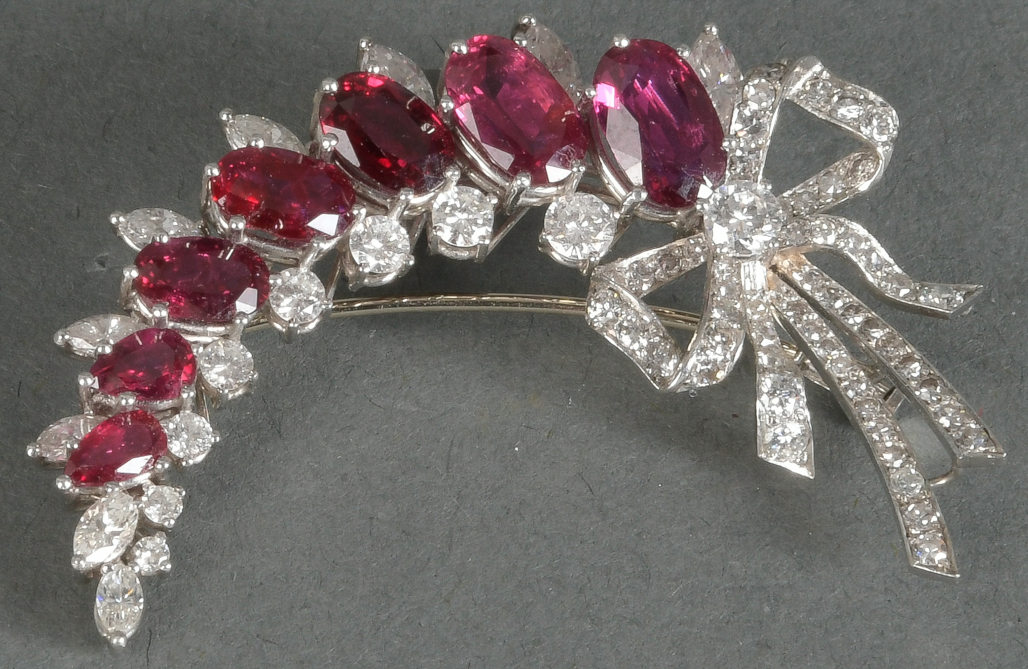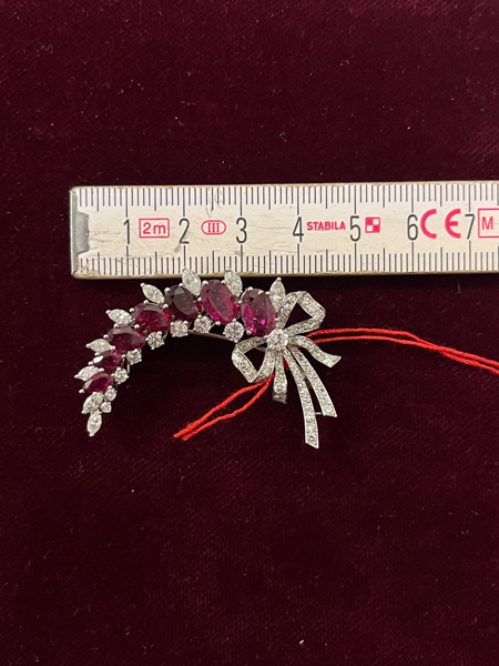 - Katalog-Nr: 1475Brosche. Platin, besetzt mit sieben Rubinen und Diamanten, ca. 1,7 ct, Gesamtgewicht ca. 12,4 g. Die Begutachtungen der verarbeiteten Edelsteine und Diamanten wurden im gefassten Zustand vorgenommen, d.h. unter Vorbehalt einer sachgerechten Graduierung, die nur an ungefassten Steinen erfolgen kann. Dies hat zur Folge, dass die Gewichte (sog. "berechnete Gewichte", d.h. ca.+/- 10 % Abweichung) und Qualitäten (Farbe, Reinheit und Schliff) der Steine nur annähernd angegeben werden können.o.L.