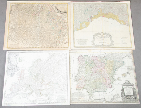 - Katalog-Nr: 1452Franz Ludwig Güssefeld (1744-1808) / Homann'sche Erben u.a. Vier Karten von Europa, Spanien, Genua und Kriegsschauplätze. Colorierte Kupferstiche mit Wappenkartusche, sign./teilw. dat., 45 x 53 bis 47 x 57 cm. (min. berieben)o.L.