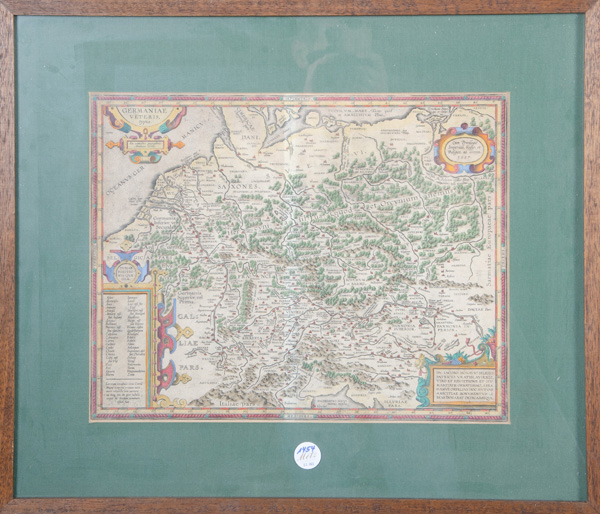 - Katalog-Nr: 1454Abraham Ortelius (1527-1598). Deutschlandkarte. Colorierter Kupferstich, li./u./sign., mit Passepartout hi./Gl. gerahmt, 34 x 44 cm. (späterer Abzug)o.L.