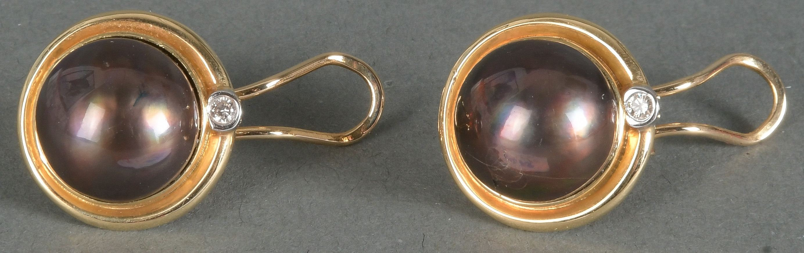 - Katalog-Nr: 1478Paar Ohrclips. 18 kt Gold, besetzt mit Mabé-Perlen und Brillanten, ca. 0,06 ct, Gesamtgewicht ca. 10,7 g. Die Begutachtungen der verarbeiteten Edelsteine und Diamanten wurden im gefassten Zustand vorgenommen, d.h. unter Vorbehalt einer sachgerechten Graduierung, die nur an ungefassten Steinen erfolgen kann. Dies hat zur Folge, dass die Gewichte (sog. "berechnete Gewichte", d.h. ca.+/- 10 % Abweichung) und Qualitäten (Farbe, Reinheit und Schliff) der Steine nur annähernd angegeben werden können.o.L.