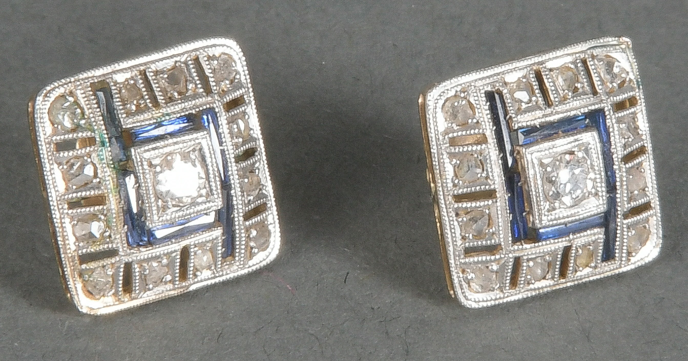 - Katalog-Nr: 1479Paar Ohrstecker. 18 kt Gold, besetzt mit Saphir, Brillanten und Diamanten, ca. 0,15 ct, Gesamtgewicht ca. 3,6 g. Die Begutachtungen der verarbeiteten Edelsteine und Diamanten wurden im gefassten Zustand vorgenommen, d.h. unter Vorbehalt einer sachgerechten Graduierung, die nur an ungefassten Steinen erfolgen kann. Dies hat zur Folge, dass die Gewichte (sog. "berechnete Gewichte", d.h. ca.+/- 10 % Abweichung) und Qualitäten (Farbe, Reinheit und Schliff) der Steine nur annähernd angegeben werden können.o.L.