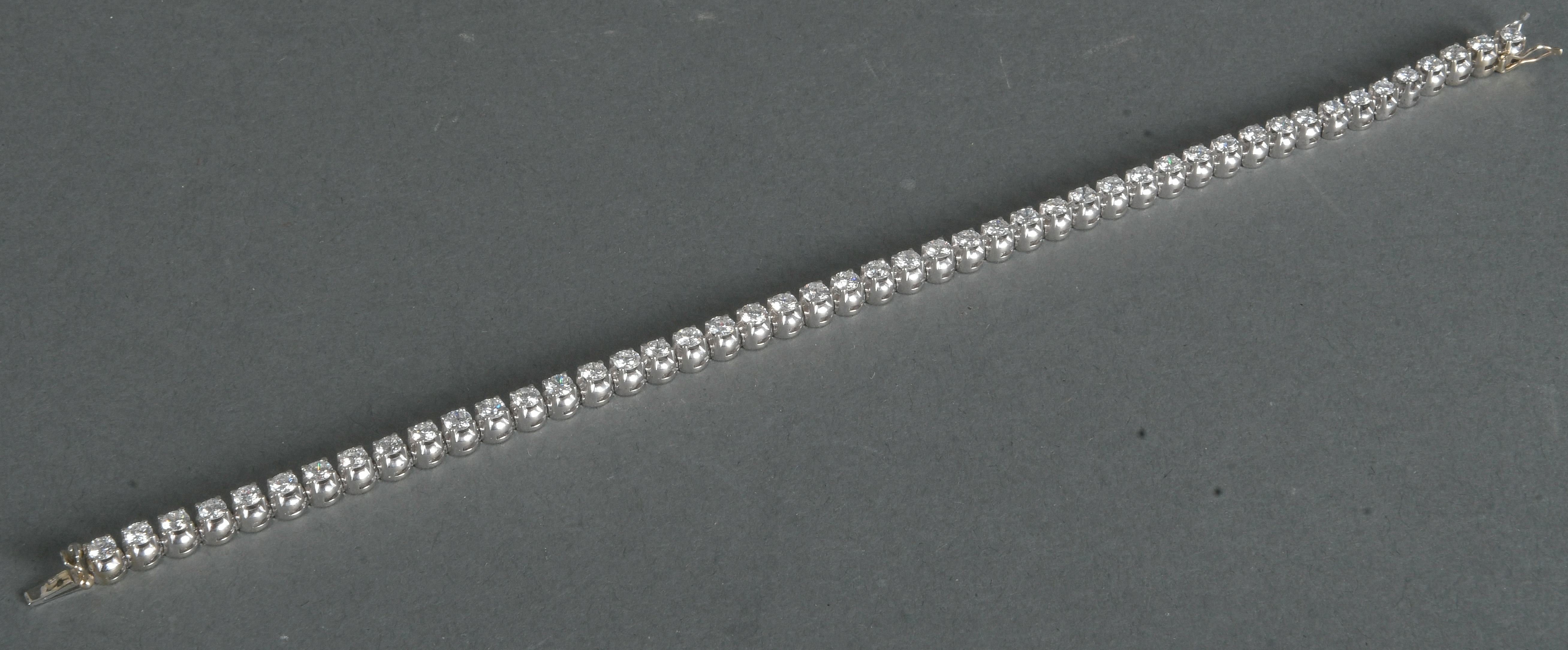 - Katalog-Nr: 1480Armband. 18 kt Gold, besetzt mit 47 Diamanten, ca. 4,8 ct, Gesamtgewicht ca. 16,19 g, L=19,2 cm. Mit Wertgutachen von Gabriele Maria Eppli vom 14.2.1985, Wiederbeschaffungswert DM 17.500,00. Die Begutachtungen der verarbeiteten Edelsteine und Diamanten wurden im gefassten Zustand vorgenommen, d.h. unter Vorbehalt einer sachgerechten Graduierung, die nur an ungefassten Steinen erfolgen kann. Dies hat zur Folge, dass die Gewichte (sog. "berechnete Gewichte", d.h. ca.+/- 10 % Abweichung) und Qualitäten (Farbe, Reinheit und Schliff) der Steine nur annähernd angegeben werden können.o.L.