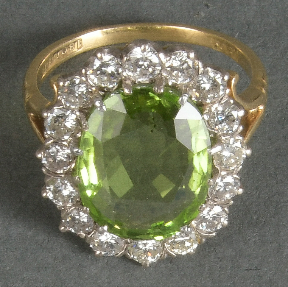 - Katalog-Nr: 1484Damenring. 18 kt Gold, besetzt mit Peridot und 16 Brillanten, ca. 0,90 ct, Gesamtgewicht ca. 5,5 g, Ringgröße 50. Die Begutachtungen der verarbeiteten Edelsteine und Diamanten wurden im gefassten Zustand vorgenommen, d.h. unter Vorbehalt einer sachgerechten Graduierung, die nur an ungefassten Steinen erfolgen kann. Dies hat zur Folge, dass die Gewichte (sog. "berechnete Gewichte", d.h. ca.+/- 10 % Abweichung) und Qualitäten (Farbe, Reinheit und Schliff) der Steine nur annähernd angegeben werden können.o.L.