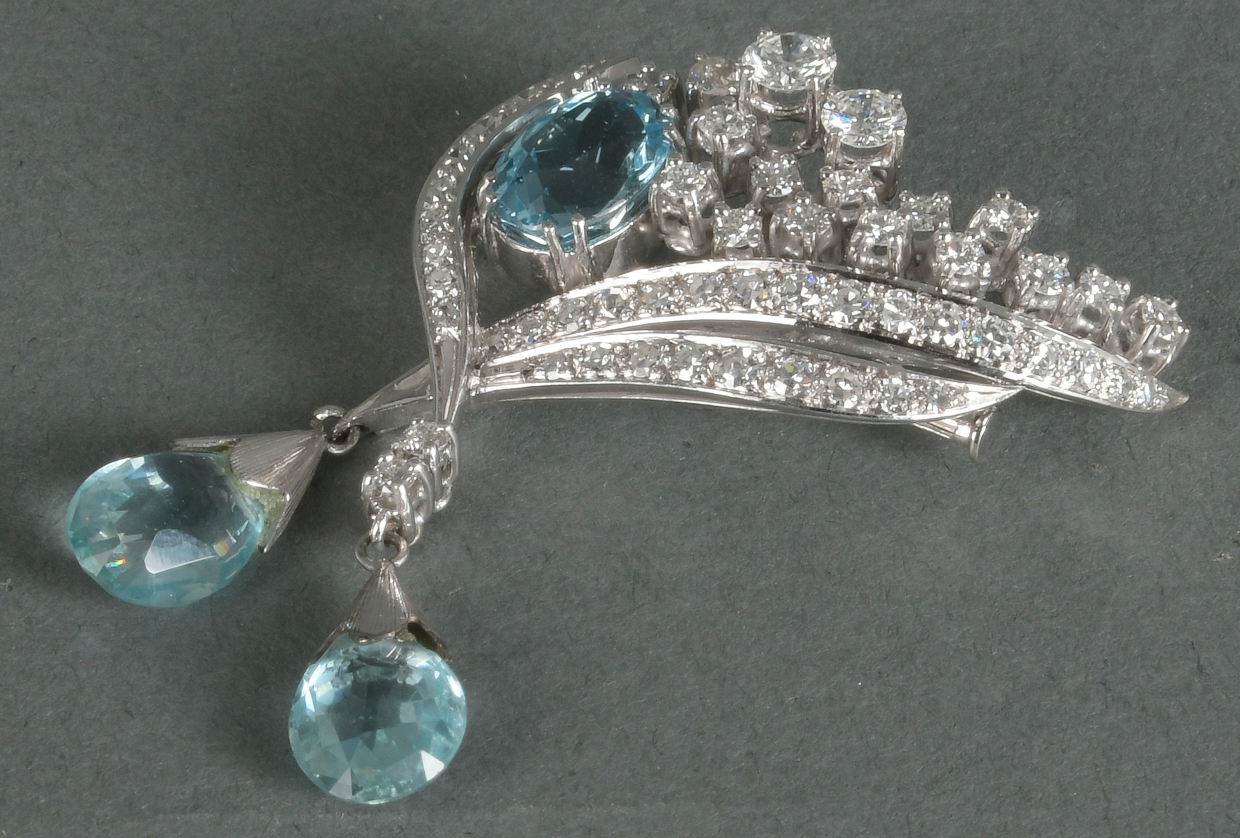 - Katalog-Nr: 1485Brosche, Marke „Schilling“. 18 kt Gold, besetzt mit drei Aquamarinen, Brillanten und Diamanten, ca. 1,80 ct, Gesamtgewicht ca. 10,2 g. Die Begutachtungen der verarbeiteten Edelsteine und Diamanten wurden im gefassten Zustand vorgenommen, d.h. unter Vorbehalt einer sachgerechten Graduierung, die nur an ungefassten Steinen erfolgen kann. Dies hat zur Folge, dass die Gewichte (sog. "berechnete Gewichte", d.h. ca.+/- 10 % Abweichung) und Qualitäten (Farbe, Reinheit und Schliff) der Steine nur annähernd angegeben werden können.o.L.