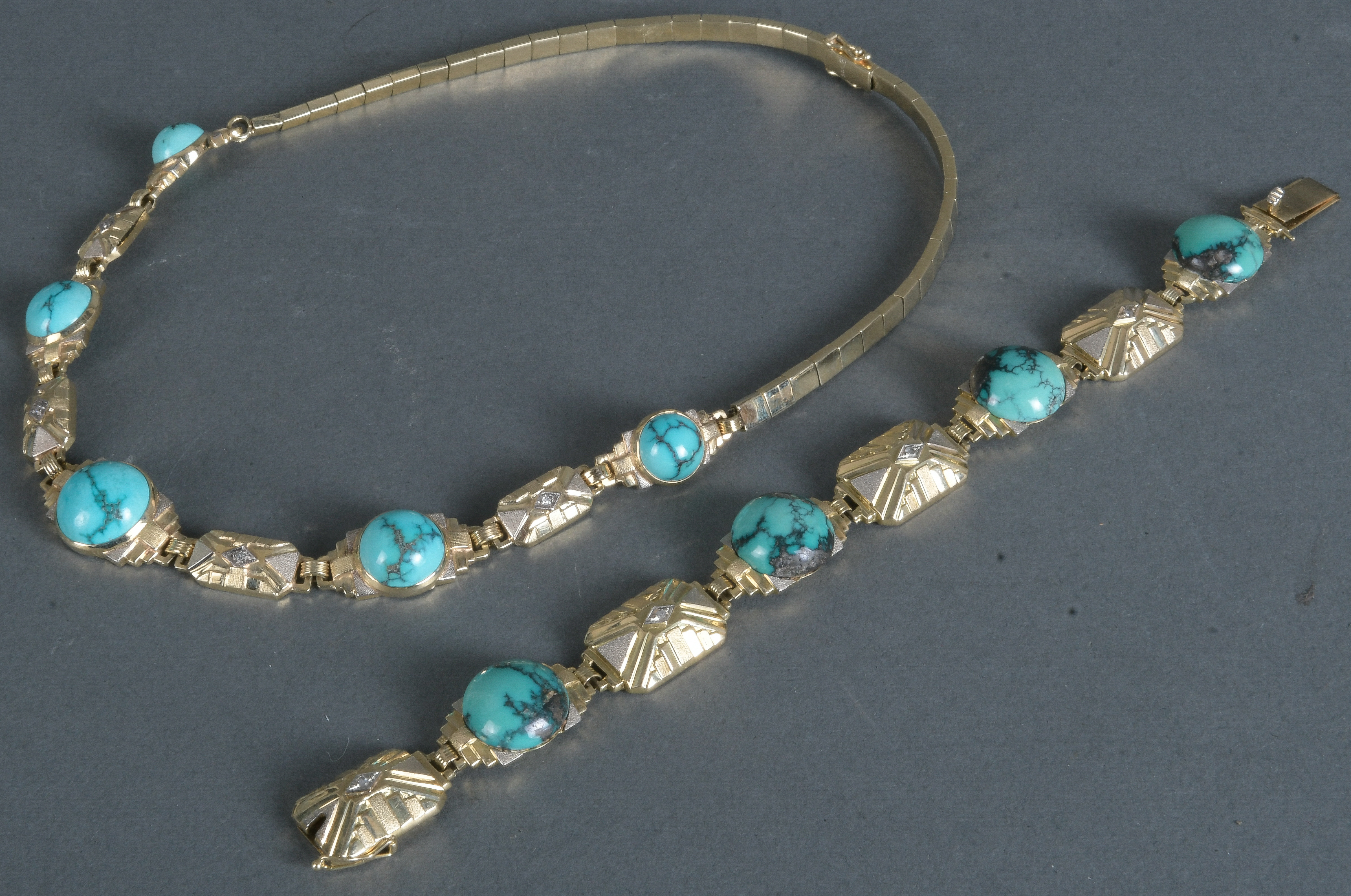 - Katalog-Nr: 1488Collier und Armband. 14 kt Gold, besetzt mit Türkisen und Diamanten, ca. 0,10 ct, Gesamtgewicht 79,5 g, L=42 / 18,5 cm. Die Begutachtungen der verarbeiteten Edelsteine und Diamanten wurden im gefassten Zustand vorgenommen, d.h. unter Vorbehalt einer sachgerechten Graduierung, die nur an ungefassten Steinen erfolgen kann. Dies hat zur Folge, dass die Gewichte (sog. "berechnete Gewichte", d.h. ca.+/- 10 % Abweichung) und Qualitäten (Farbe, Reinheit und Schliff) der Steine nur annähernd angegeben werden können.o.L.
