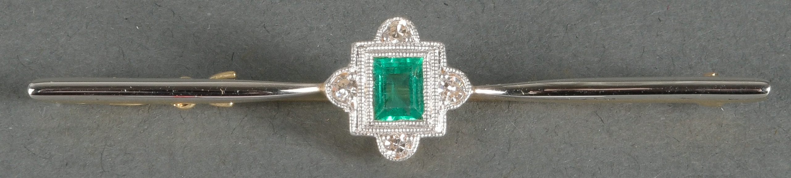 - Katalog-Nr: 1489Stabnadelbrosche. 14 kt Gold, besetzt mit Smaragd und Diamanten, ca. 0,06 ct, Gesamtgewicht ca. 3,1 g. Die Begutachtungen der verarbeiteten Edelsteine und Diamanten wurden im gefassten Zustand vorgenommen, d.h. unter Vorbehalt einer sachgerechten Graduierung, die nur an ungefassten Steinen erfolgen kann. Dies hat zur Folge, dass die Gewichte (sog. "berechnete Gewichte", d.h. ca.+/- 10 % Abweichung) und Qualitäten (Farbe, Reinheit und Schliff) der Steine nur annähernd angegeben werden können.o.L.