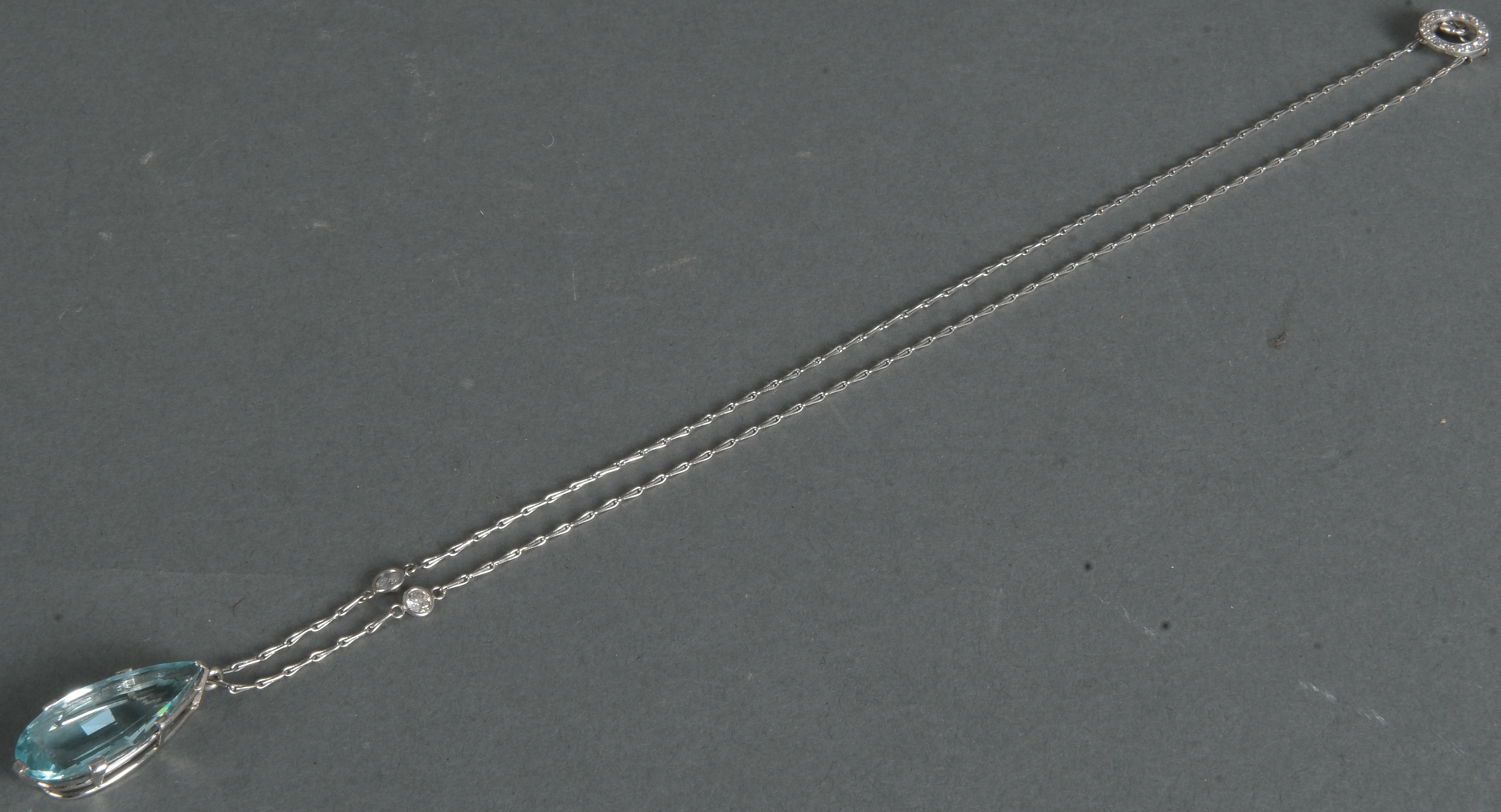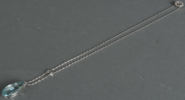 - Katalog-Nr: 1494Halskette mit Anhänger. 18 kt Gold, besetzt mit Aquamarin und Altschliff-Brillanten, ca. 0,40 ct, Gesamtgewicht ca. 9,5 g, L=47 cm. Die Begutachtungen der verarbeiteten Edelsteine und Diamanten wurden im gefassten Zustand vorgenommen, d.h. unter Vorbehalt einer sachgerechten Graduierung, die nur an ungefassten Steinen erfolgen kann. Dies hat zur Folge, dass die Gewichte (sog. "berechnete Gewichte", d.h. ca.+/- 10 % Abweichung) und Qualitäten (Farbe, Reinheit und Schliff) der Steine nur annähernd angegeben werden können.o.L.