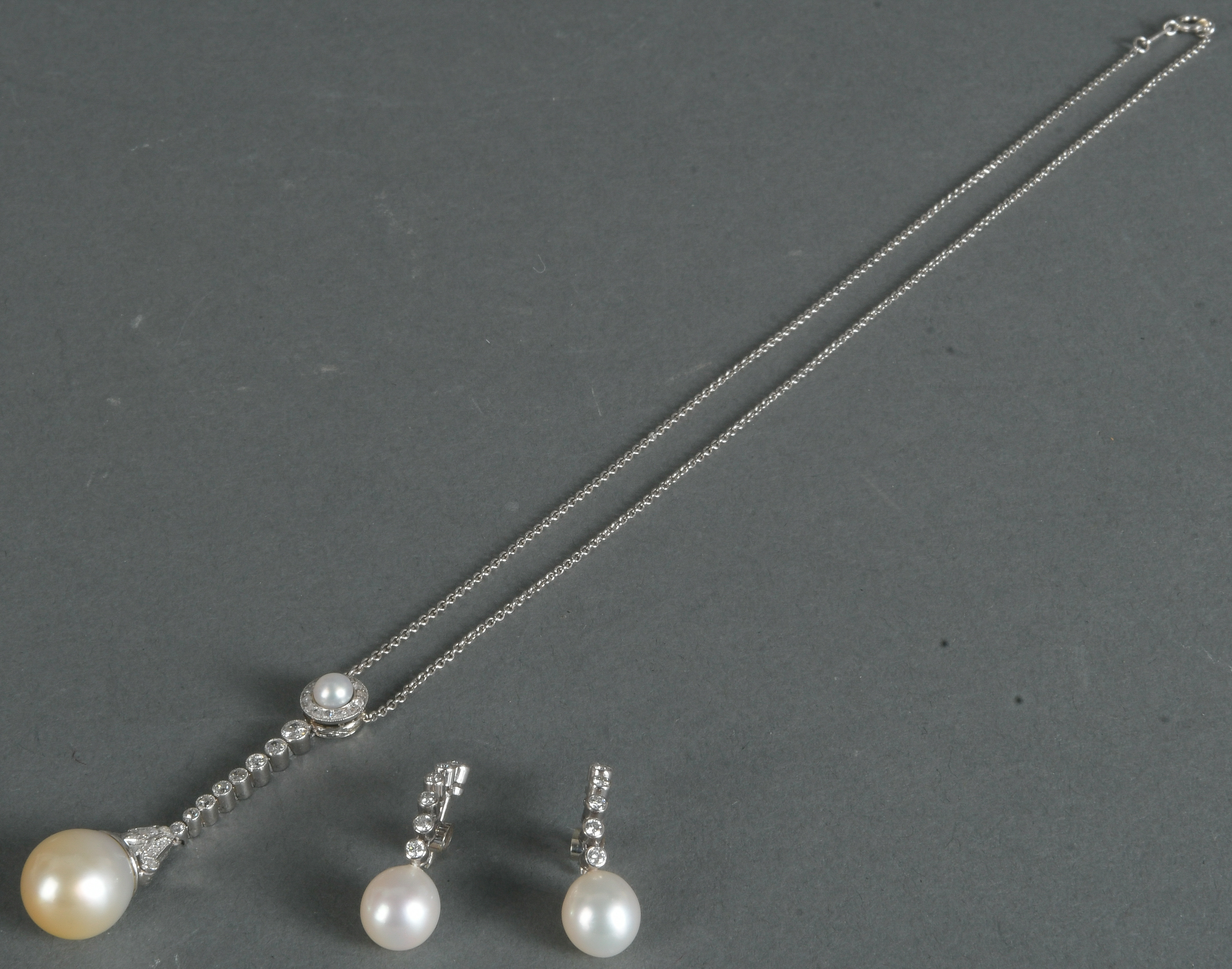 - Katalog-Nr: 1500Collier. 950er Platin, besetzt mit Südseeperle, Gesamtgewicht ca. 12,2 g, L=41 cm; dazu ein Paar Ohrhänger. 18 kt Gold, besetzt mit Brillanten, ca. 0,50 ct, und je einer Perle, Gesamtgewicht ca. 5,5 g. Die Begutachtungen der verarbeiteten Edelsteine und Diamanten wurden im gefassten Zustand vorgenommen, d.h. unter Vorbehalt einer sachgerechten Graduierung, die nur an ungefassten Steinen erfolgen kann. Dies hat zur Folge, dass die Gewichte (sog. "berechnete Gewichte", d.h. ca.+/- 10 % Abweichung) und Qualitäten (Farbe, Reinheit und Schliff) der Steine nur annähernd angegeben werden können.o.L.
