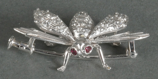 - Katalog-Nr: 1487Brosche. 18 kt Gold, besetzt mit zwei Rubinen und Brillanten, ca. 0,50 ct, Gesamtgewicht ca. 6,0 g. Die Begutachtungen der verarbeiteten Edelsteine und Diamanten wurden im gefassten Zustand vorgenommen, d.h. unter Vorbehalt einer sachgerechten Graduierung, die nur an ungefassten Steinen erfolgen kann. Dies hat zur Folge, dass die Gewichte (sog. "berechnete Gewichte", d.h. ca.+/- 10 % Abweichung) und Qualitäten (Farbe, Reinheit und Schliff) der Steine nur annähernd angegeben werden können.o.L.