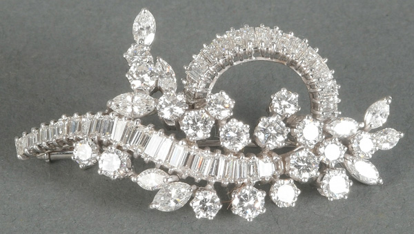 - Katalog-Nr: 1490Brosche. 14 kt Gold, besetzt mit Brillanten und Diamanten, ca. 4,20 ct, Gesamtgewicht ca. 9,3 g. Die Begutachtungen der verarbeiteten Edelsteine und Diamanten wurden im gefassten Zustand vorgenommen, d.h. unter Vorbehalt einer sachgerechten Graduierung, die nur an ungefassten Steinen erfolgen kann. Dies hat zur Folge, dass die Gewichte (sog. "berechnete Gewichte", d.h. ca.+/- 10 % Abweichung) und Qualitäten (Farbe, Reinheit und Schliff) der Steine nur annähernd angegeben werden können.o.L.