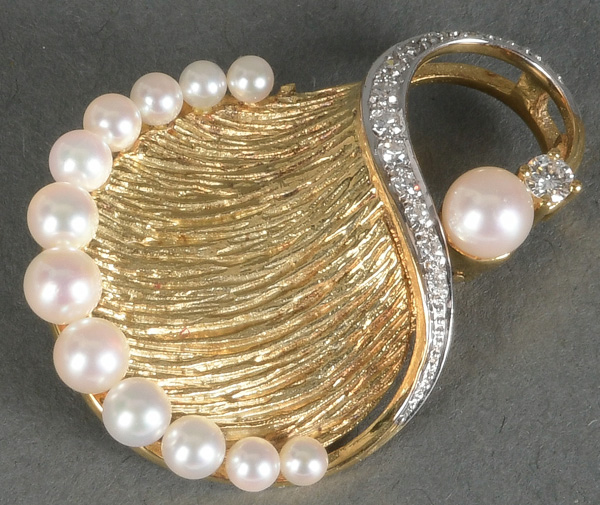 - Katalog-Nr: 1497Brosche. 14 kt Gold, besetzt mit Zuchtperlen und Diamanten, ca. 0,20 ct, Gesamtgewicht ca. 9,0 g. Die Begutachtungen der verarbeiteten Edelsteine und Diamanten wurden im gefassten Zustand vorgenommen, d.h. unter Vorbehalt einer sachgerechten Graduierung, die nur an ungefassten Steinen erfolgen kann. Dies hat zur Folge, dass die Gewichte (sog. "berechnete Gewichte", d.h. ca.+/- 10 % Abweichung) und Qualitäten (Farbe, Reinheit und Schliff) der Steine nur annähernd angegeben werden können.o.L.