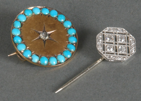 - Katalog-Nr: 1498Zweitlgs. Schmuckkonvolut: Eine Brosche, 14 kt Gold, besetzt mit Türkis und Diamanten, ca. 0,02 ct, Gesamtgewicht ca. 3,4 g; eine Anstecknadel, 18 kt Gold, besetzt mit Altschliff-Brillanten, ca. 0,40 ct, Gesamtgewicht ca. 1,5 g. Die Begutachtungen der verarbeiteten Edelsteine und Diamanten wurden im gefassten Zustand vorgenommen, d.h. unter Vorbehalt einer sachgerechten Graduierung, die nur an ungefassten Steinen erfolgen kann. Dies hat zur Folge, dass die Gewichte (sog. "berechnete Gewichte", d.h. ca.+/- 10 % Abweichung) und Qualitäten (Farbe, Reinheit und Schliff) der Steine nur annähernd angegeben werden können.o.L.