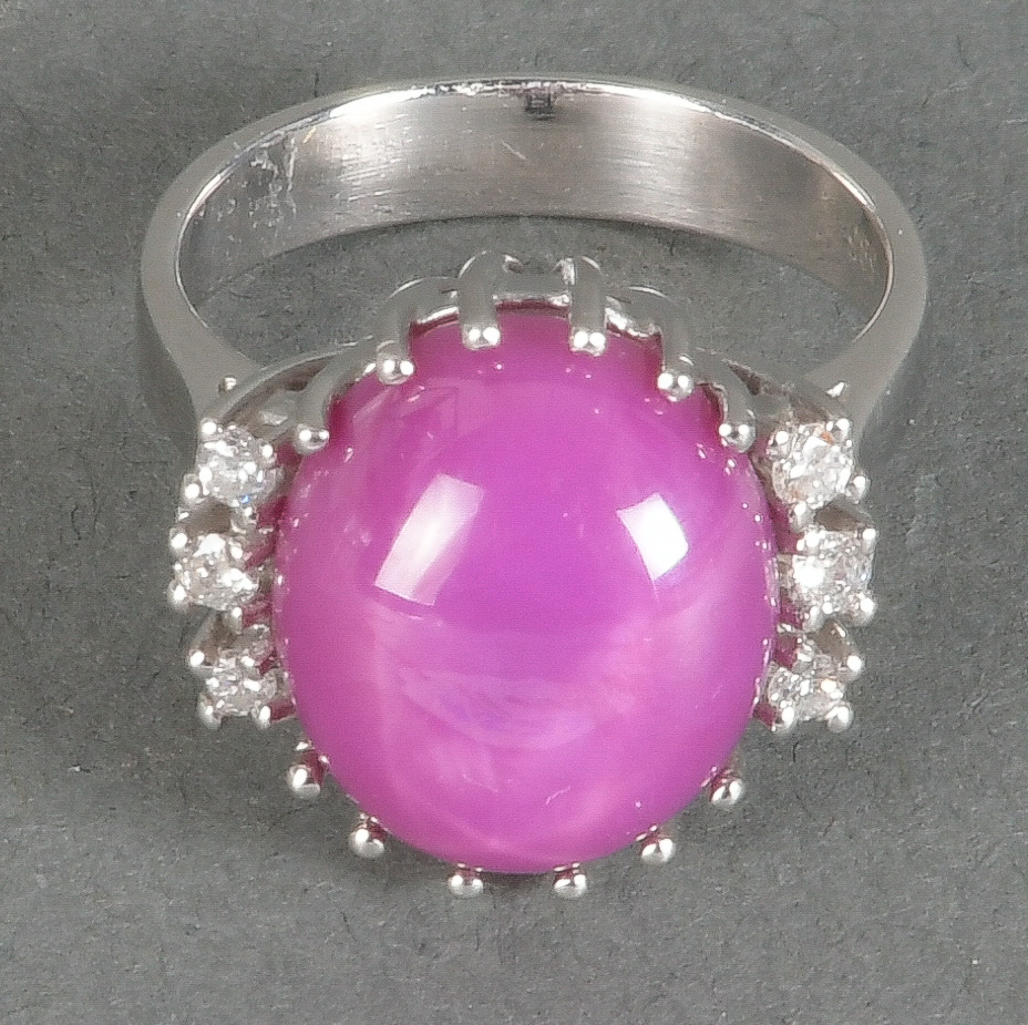 - Katalog-Nr: 1527Damenring. 14 kt Gold, besetzt mit Sternrubin und sechs Brillanten, ca. 0,15 ct, Gesamtgewicht ca. 6,4 g, Ringgröße 50. Die Begutachtungen der verarbeiteten Edelsteine und Diamanten wurden im gefassten Zustand vorgenommen, d.h. unter Vorbehalt einer sachgerechten Graduierung, die nur an ungefassten Steinen erfolgen kann. Dies hat zur Folge, dass die Gewichte (sog. "berechnete Gewichte", d.h. ca.+/- 10 % Abweichung) und Qualitäten (Farbe, Reinheit und Schliff) der Steine nur annähernd angegeben werden können.o.L.