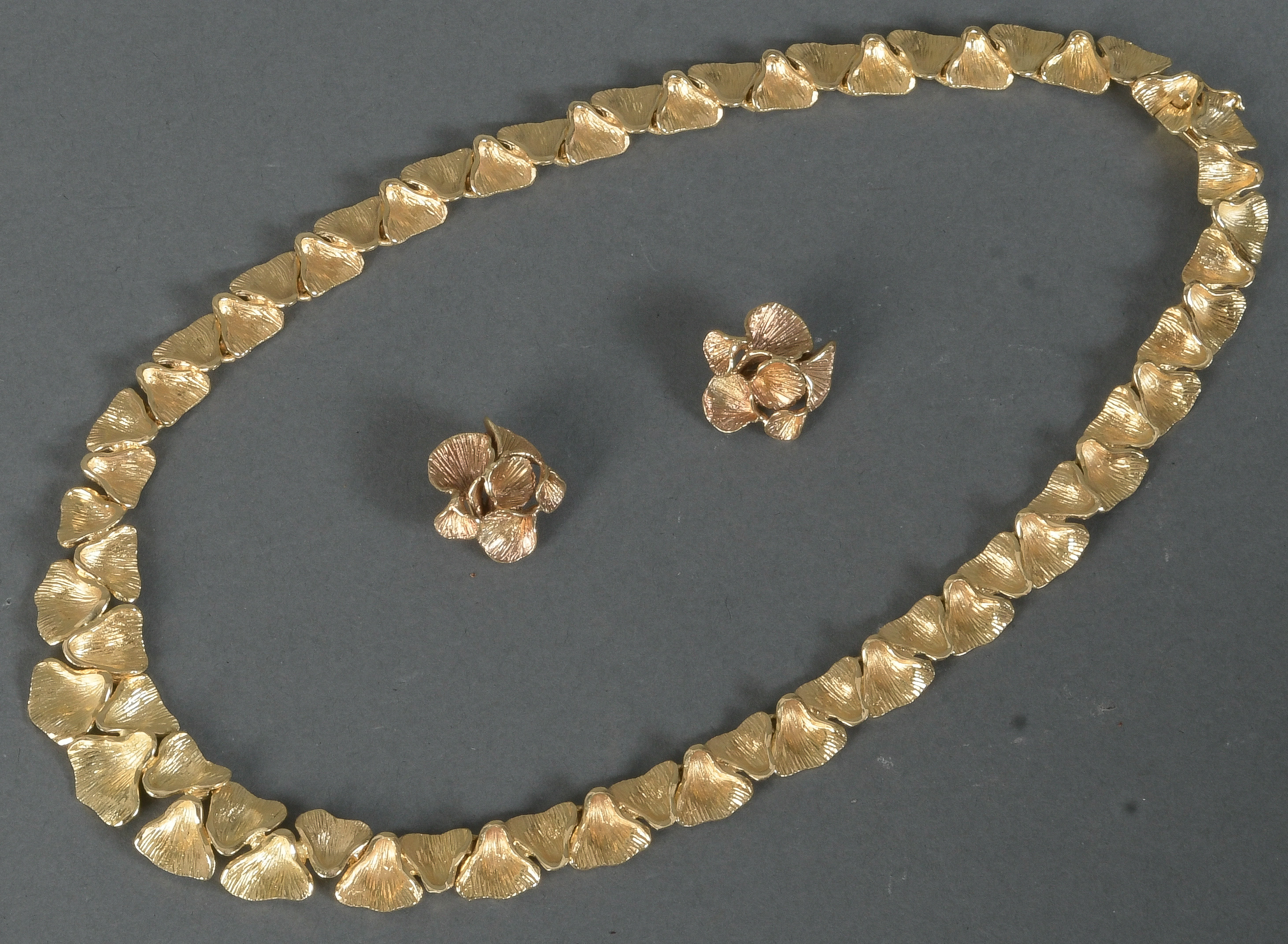 - Katalog-Nr: 1530Collier. 18 kt Gold, ca. 57,1 g, L=39 cm; dazu ein Paar passende Ohrclips. 14 kt Gold, ca. 6,9 g.o.L.