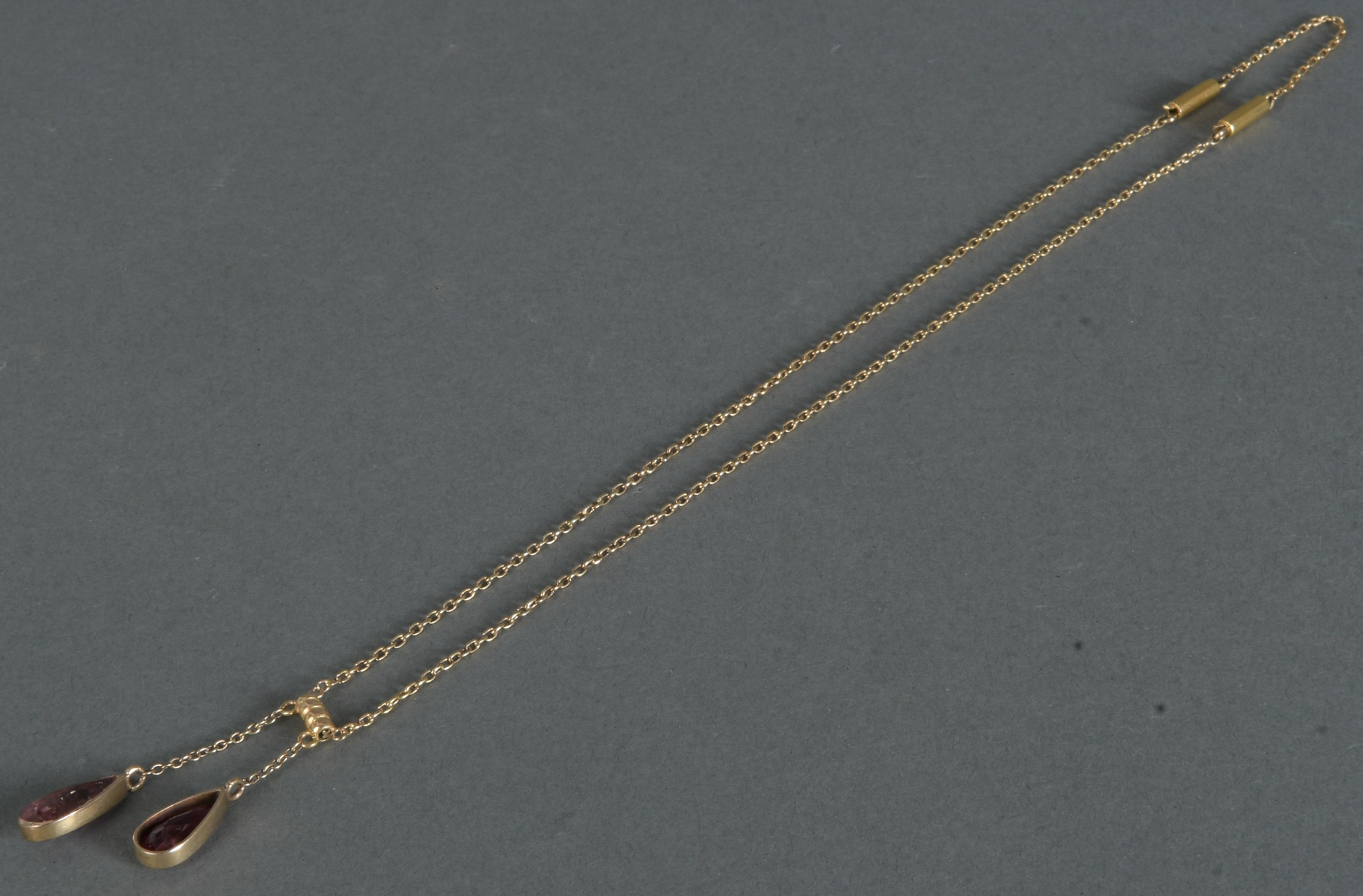 - Katalog-Nr: 1531Collier. 14 kt Gold, besetzt mit zwei Turmalinen, Gesamtgewicht ca. 5,6 g, L=42 cm.o.L.