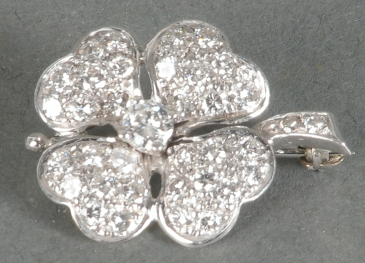 - Katalog-Nr: 1533Brosche. 18 kt Gold, besetzt mit Brillanten, ca. 1,15 ct, Gesamtgewicht ca. 3,4 g. Die Begutachtungen der verarbeiteten Edelsteine und Diamanten wurden im gefassten Zustand vorgenommen, d.h. unter Vorbehalt einer sachgerechten Graduierung, die nur an ungefassten Steinen erfolgen kann. Dies hat zur Folge, dass die Gewichte (sog. "berechnete Gewichte", d.h. ca.+/- 10 % Abweichung) und Qualitäten (Farbe, Reinheit und Schliff) der Steine nur annähernd angegeben werden können.o.L.