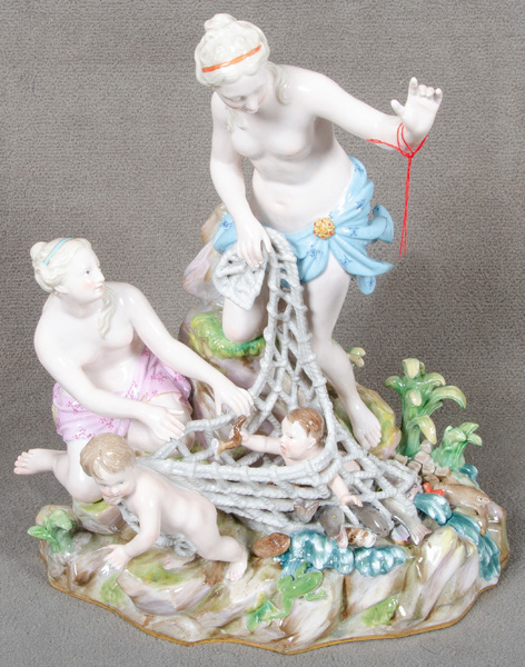 - Katalog-Nr: 1534Tritonenfang. Meissen 19. Jh. Porzellan, bunt bemalt; am Boden unterglasurblaue Schwertermarke, Formnummer „C35“, Modell nach Johann Carl Schönheit, H=32 cm.o.L.