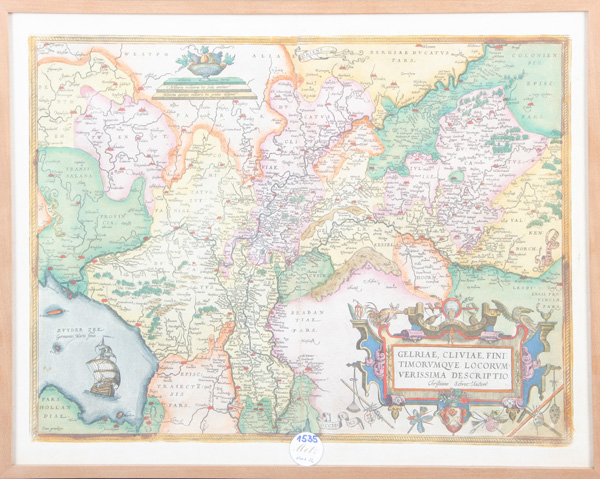 - Katalog-Nr: 1535Abraham Ortelius (1527-1598). Landkarte des Gebiets der Herzogtümer Geldern, Kleve und Jülich. Colorierter Kupferstich mit Wappenkartusche, hi./Gl. gerahmt, 37 x 50 cm. (späterer Abzug)o.L.