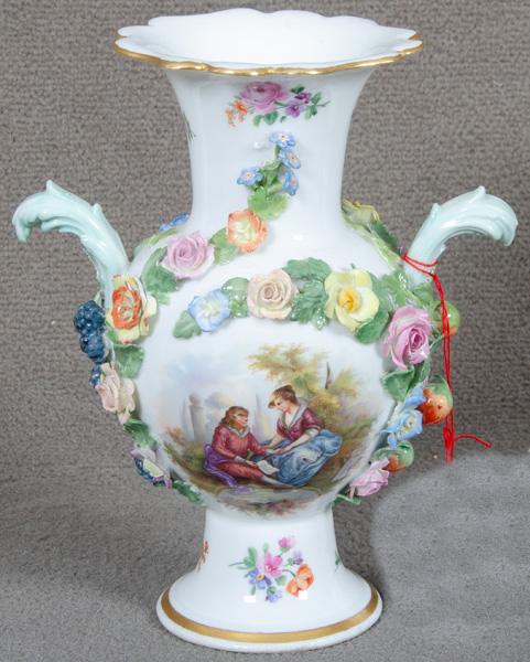 - Katalog-Nr: 1536Prunkvase. Meissen 19. Jh. Porzellan, aufwendig reliefiert mit Blüten und Blättern, Reserven bunt bemalt mit Watteauszenen und Blumenbouquets; am Boden unterglasurblaue Schwertermarke, D=16,2 cm. (min. rest.)o.L.