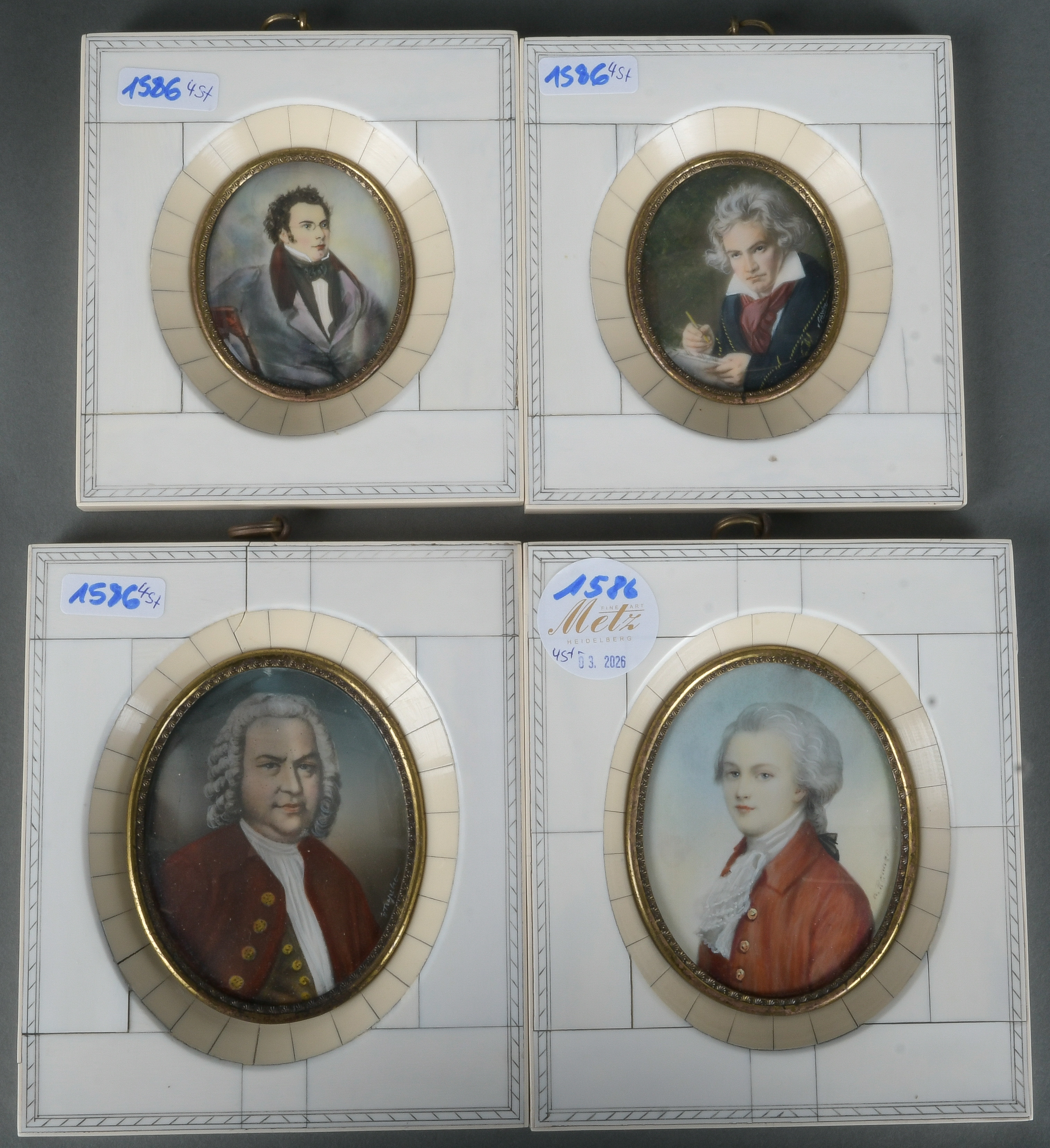 - Katalog-Nr: 1586Vier Miniaturen mit den Porträts von u.a. Ludwig van Beethoven, Johann Sebastian Bach und Franz Schubert, hi./Gl. gerahmt, 6 x 5,1 / 12,3 x 11,1 bzw. 8,3 x 6,4 / 14,2 x 12,2 cm.o.L.