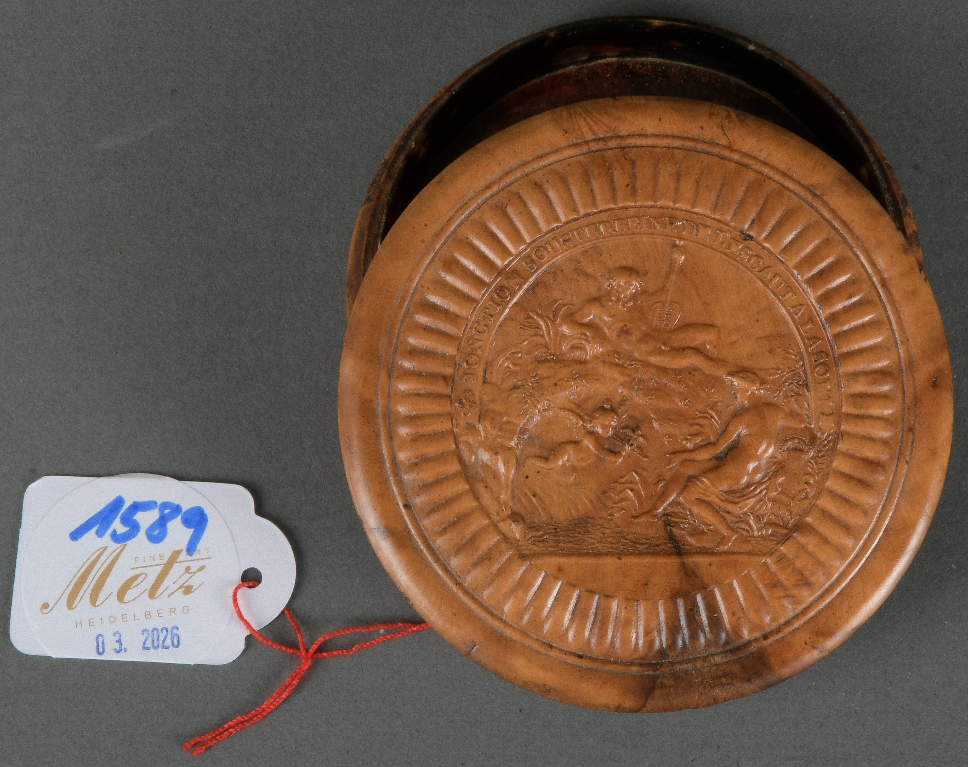 - Katalog-Nr: 1589Runde Deckeldose. Frankreich 18. Jh. Wurzelholz, geschnitzt mit mythologischer Szene und beschriftet, H=2,4 cm, D=8,2 cm.o.L.