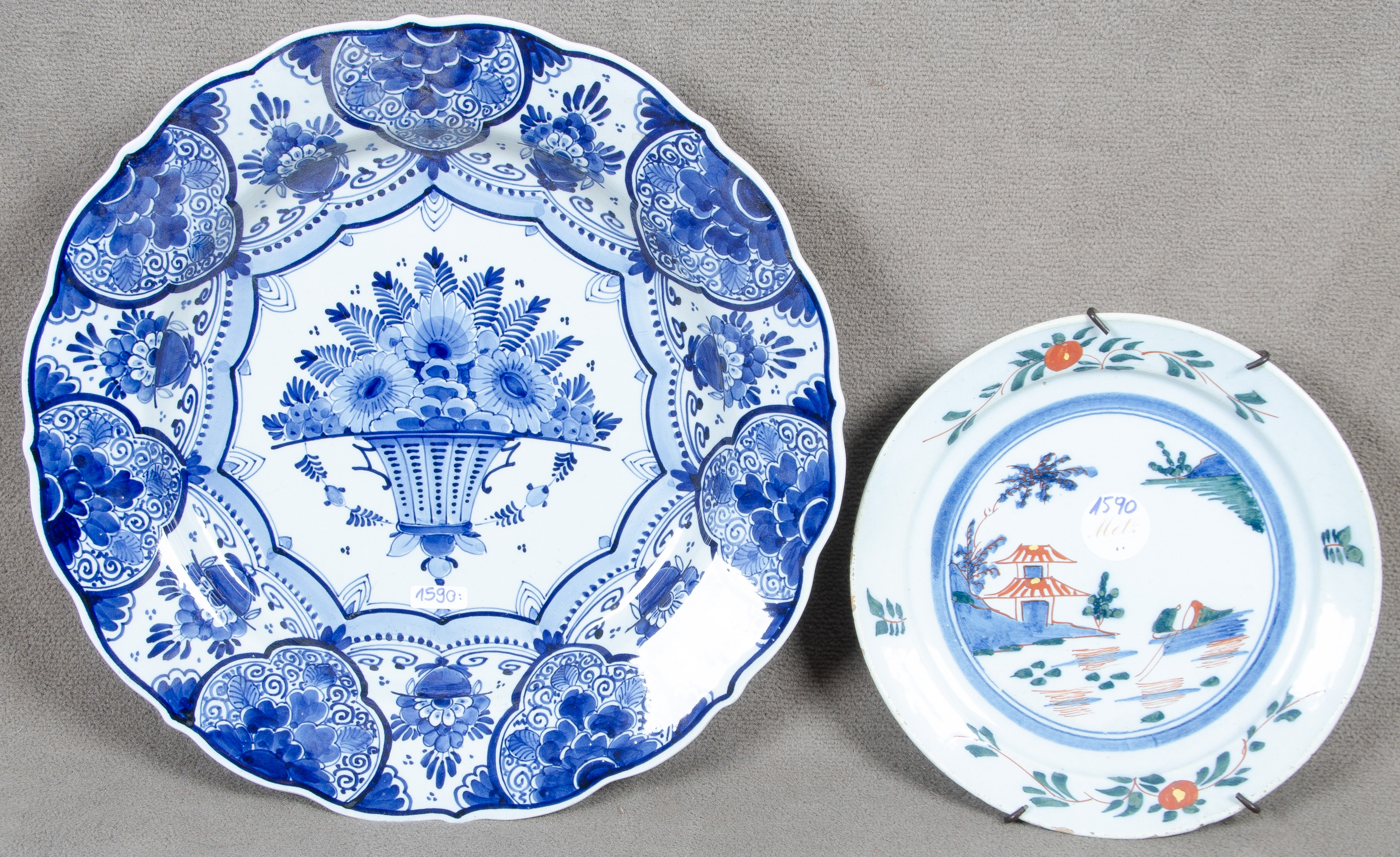 - Katalog-Nr: 1590Platte und Teller. Delft / Asien. Keramik, bunt bemalt. D= 23 / 35 cm. (Teller min. best.)o.L.
