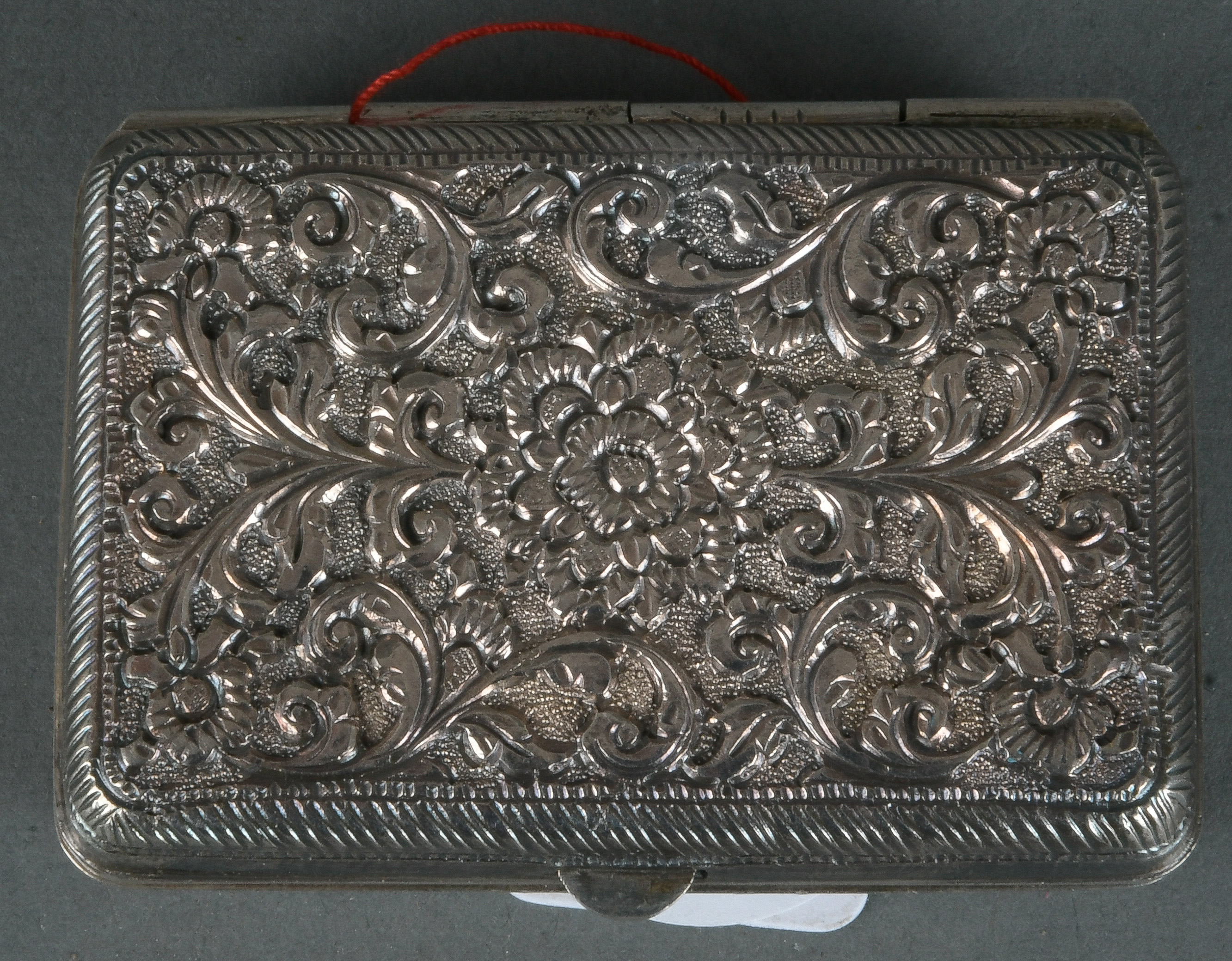 - Katalog-Nr: 1591Rechteckige Deckeldose. Wohl Italien um 1900. Silber, ca. 87 g, H=2 cm, B=7,5 cm, T=5,3 cm.o.L.