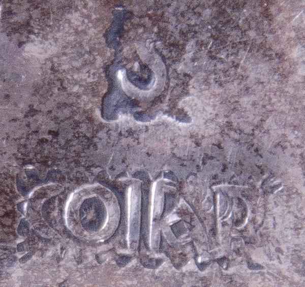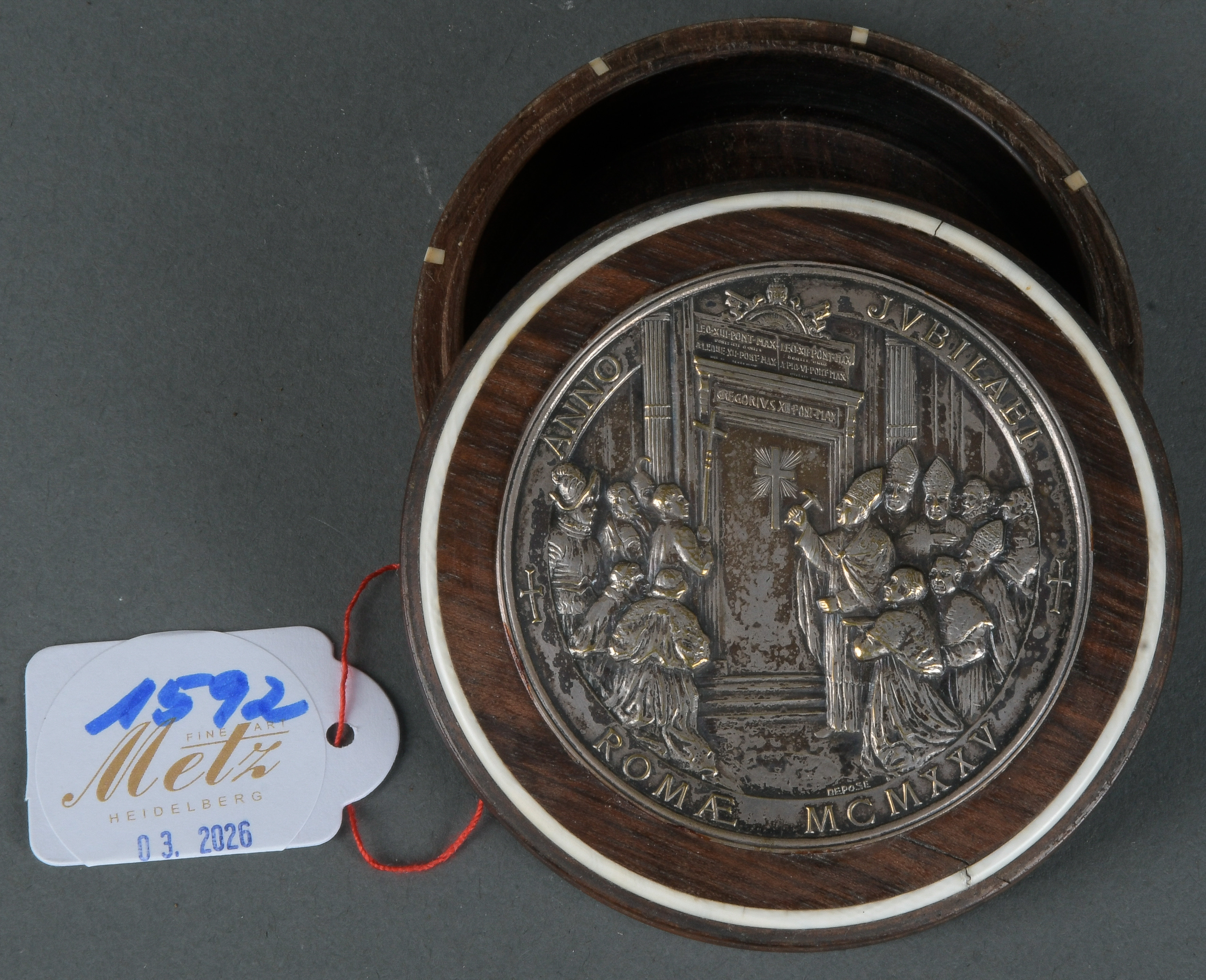 - Katalog-Nr: 1592Runde Deckeldose. Rouen dat. 1925. Massivholz mit reliefierter Silberplatte, beschriftet, H=3,1 cm, B=7,6 cm.o.L.