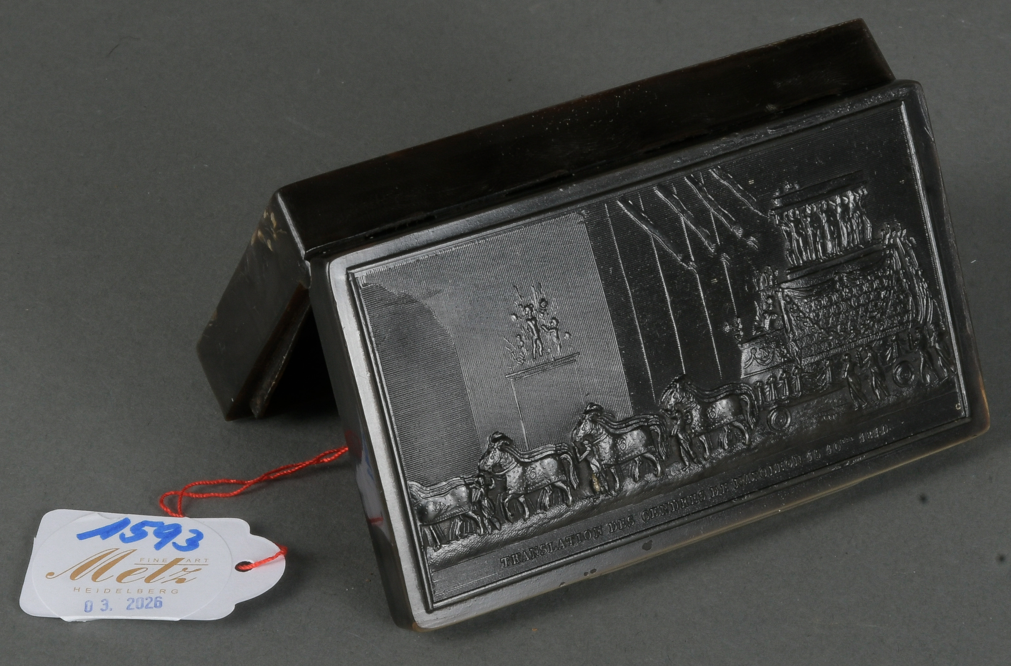 - Katalog-Nr: 1594Rechteckige Deckeldose. Paris 19. Jh. Horn, geschnitzt mit Szenerie Napoleon in Potsdam, H=1,8 cm, B=8,3 cm, T=5 cm.o.L.