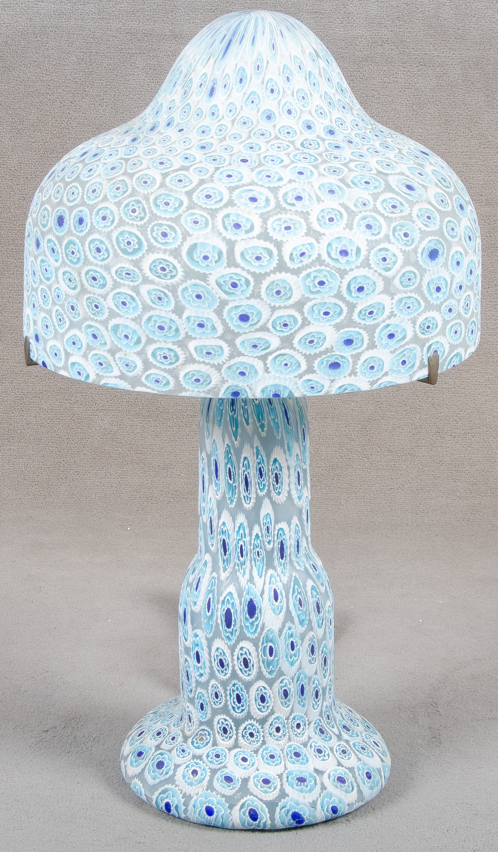 - Katalog-Nr: 1597Millefiori-Tischlampe. Italien 20. Jh. Farbloses Glas, farbig überfangen mit dem namensgebendem Dekor, H=51 cm, B=28 cm. (Funktion ungeprüft)o.L.