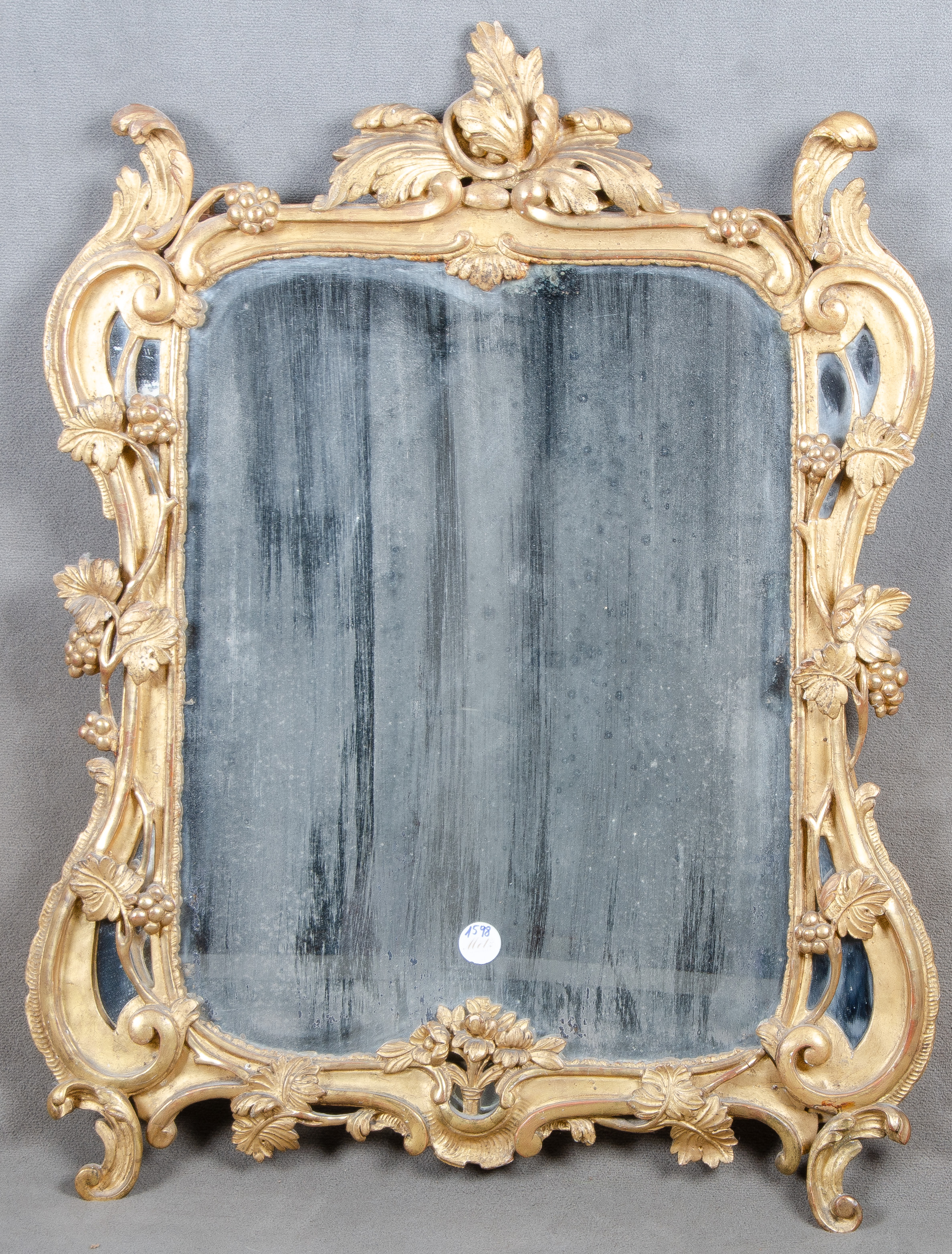 - Katalog-Nr: 1598Barock-Spiegel. Süddeutsch um 1750. Massivholz, geschnitzt, teilw. Stuck, gold gefasst, H=65 cm, B=83 cm.o.L.