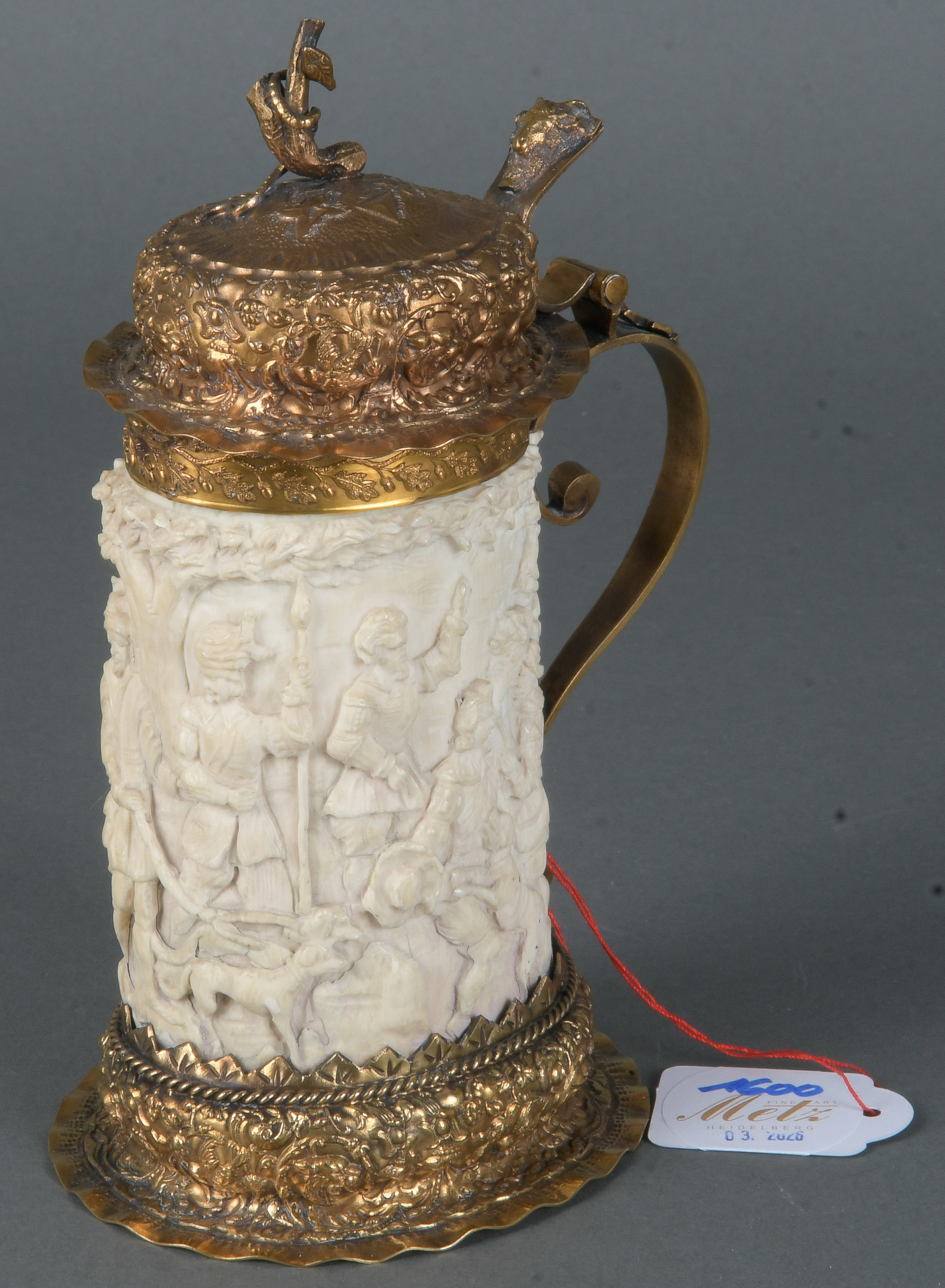 - Katalog-Nr: 1600Prunkkrug. Deutsch 19. Jh. Silber, reich ziseliert und vergoldet, H=16,7 cm.o.L.