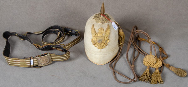 - Katalog-Nr: 1582Pickelhaube. Amerika 19. Jh. Weißer Filz mit Applikationen, Fangschnüren (Cordon raquettes) und Feldbinde; dazu Koppelschloss. (inkomplett, getragener Zustand, Kinnriemen fehlt)o.L.