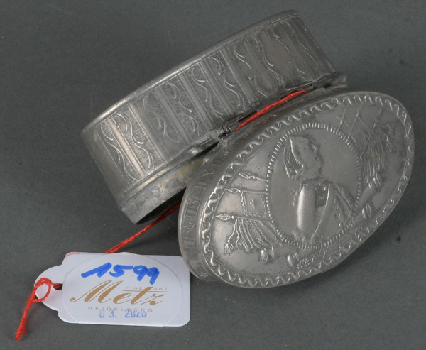 - Katalog-Nr: 1599Ovale Tabatière. Deutsch 18. Jh. Zinn, reliefiert mit Porträt, H=3,7 cm, B=7,1 cm, T=4 cm.o.L.