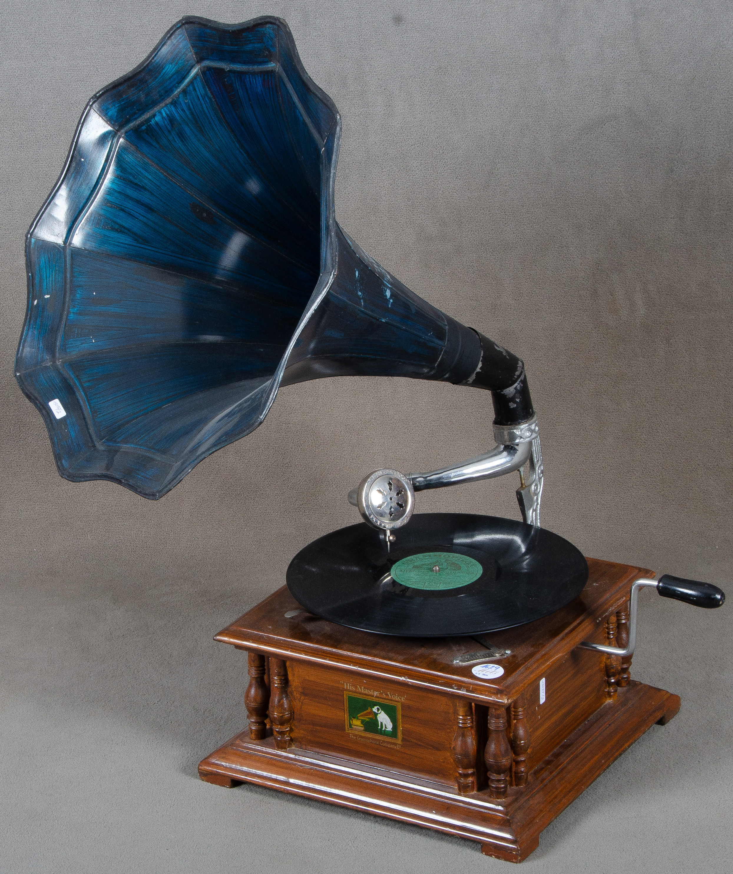 - Katalog-Nr: 1628Grammophon. Wohl USA „His Master's Voice“. Massiv Nussbaum mit Messing-Trichter; dazu eine Platte in rechteckigem, profilierten Kasten, H=71 cm, B=36 cm, T=36 cm. (Funktion ungeprüft)o.L.