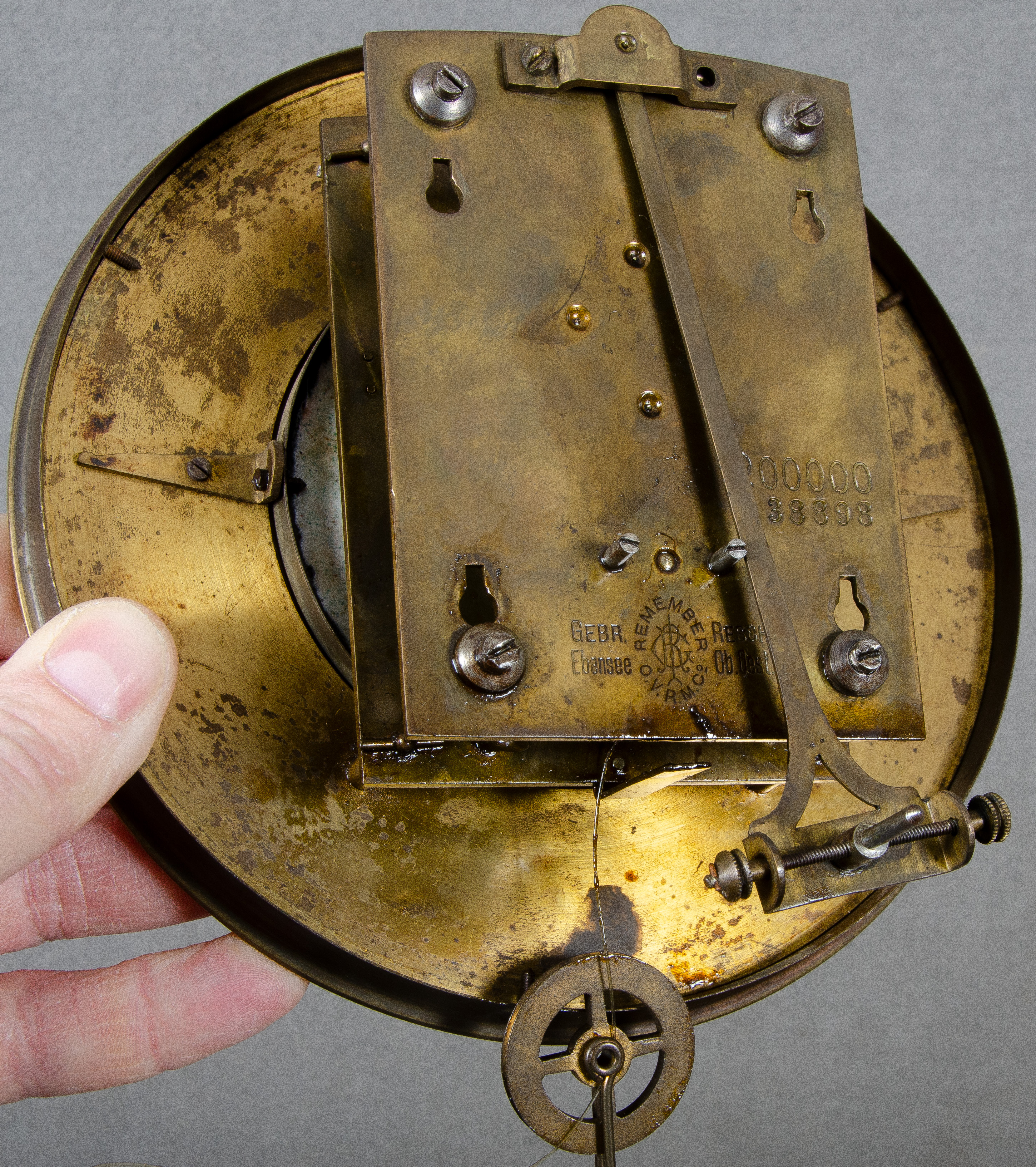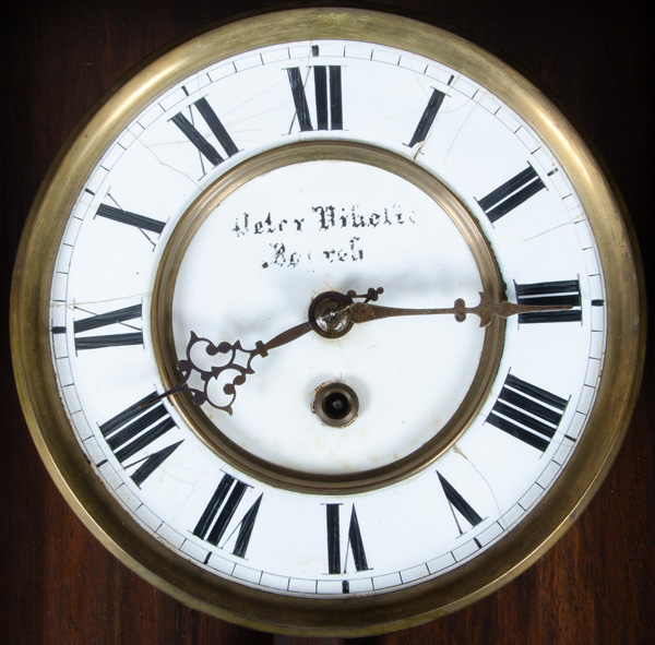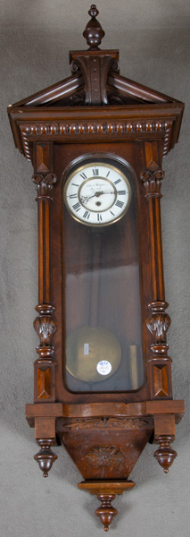- Katalog-Nr: 1631Regulator. Wien, Gebr. Resch um 1900. Nussbaum furniert, teilw. massiv, geschnitzt und gedrechselt; profilierter, verglaster Uhrenkasten, Uhrwerk verso sign. H=115 cm, B= 30,5 cm, T=18 cm. (Funktion ungeprüft)o.L.