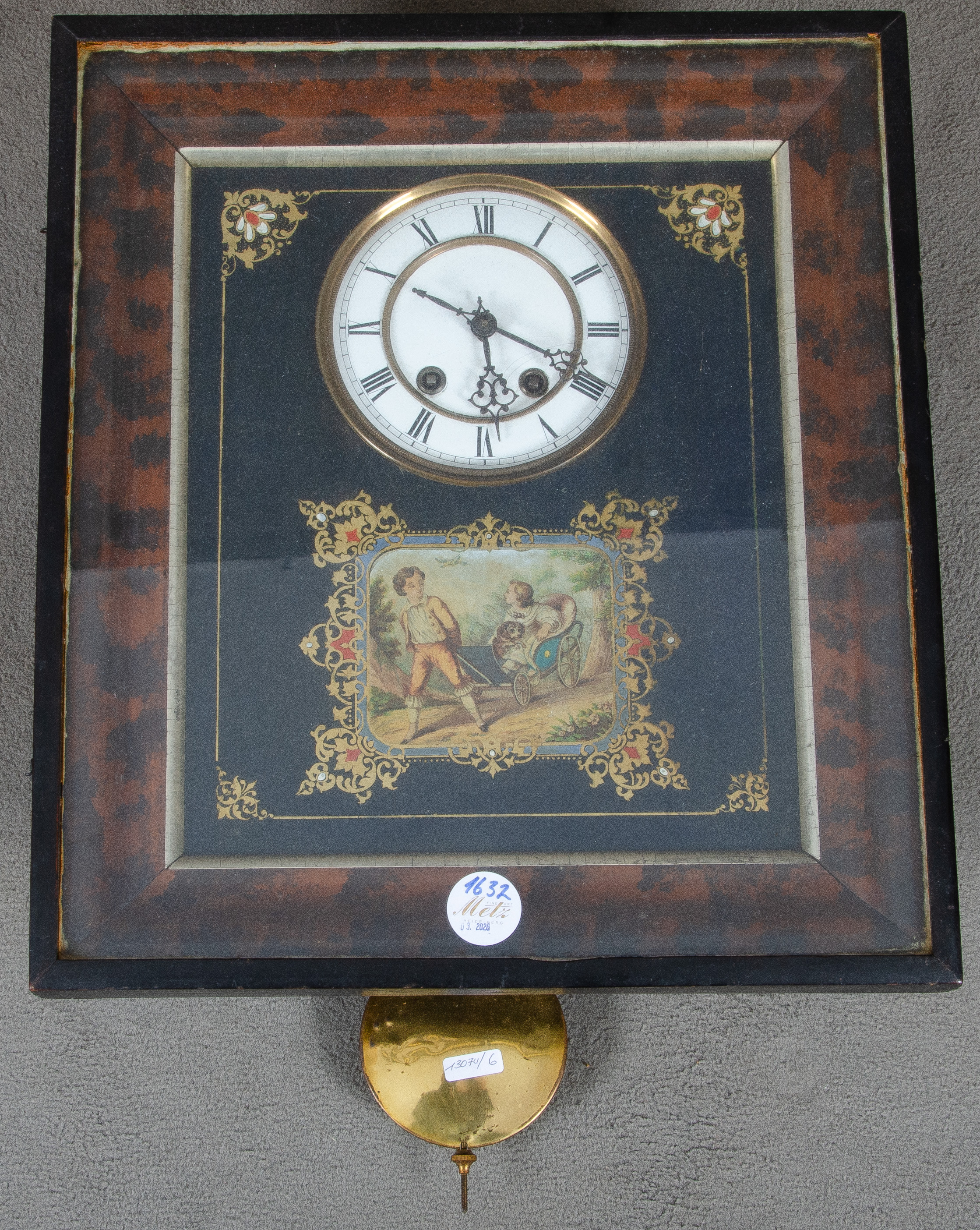 - Katalog-Nr: 1632Bilderuhr. Deutsch 19. Jh. Profilierter Holzkasten, Zifferblatt aus Emaille mit doppeltem Schlüsselaufzug, Umrahmung mit bemalten Goldkartuschen, Motiv: Kinder mit Leiterwagen, H=50 cm, B=37 cm, T=12,5 cm. (Funktion ungeprüft)o.L.