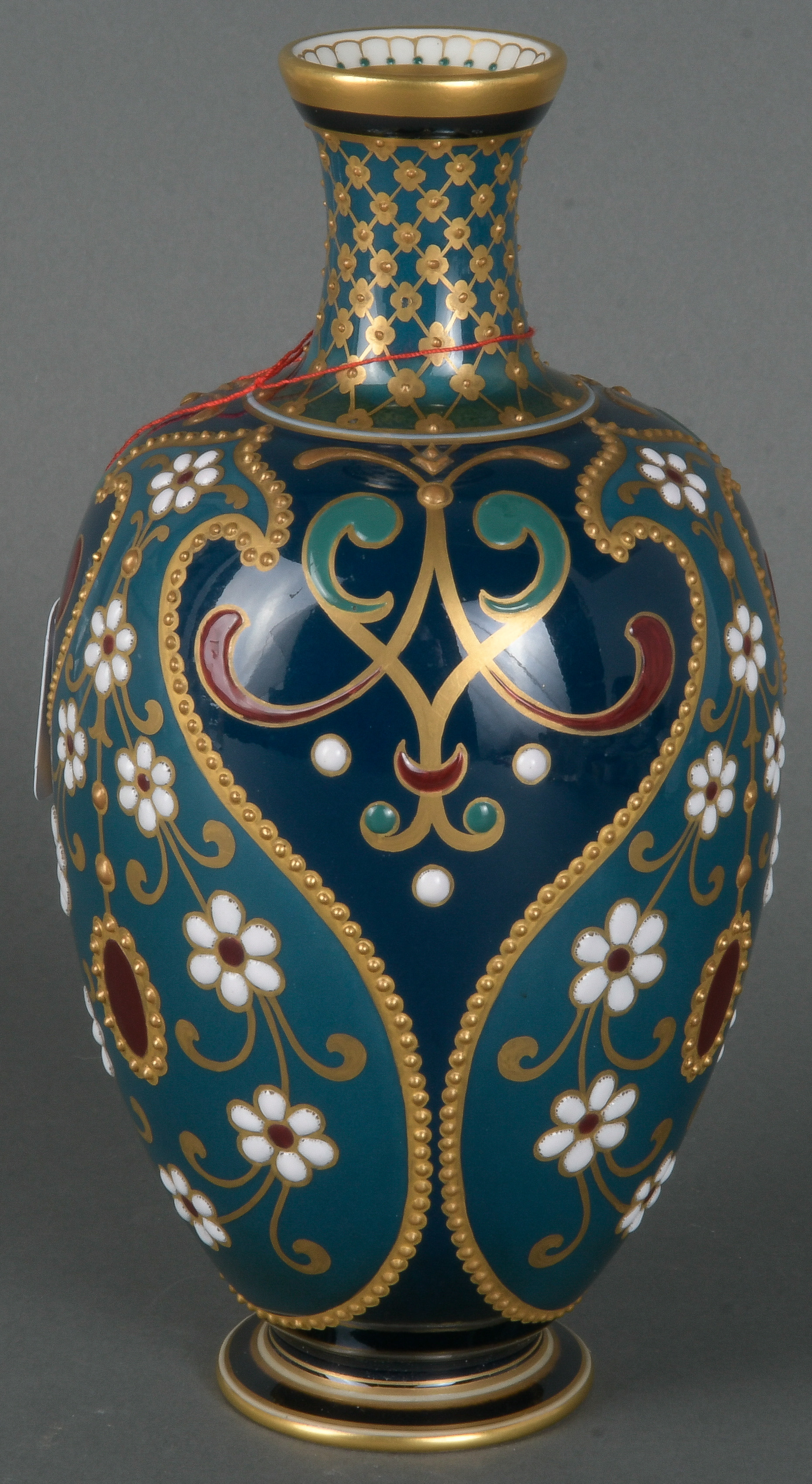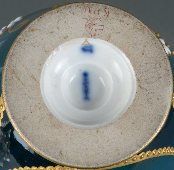 - Katalog-Nr: 1636Ausgefallene Jugendstil-Vase. Berlin um 1905. Porzellan, farbig glasiert mit aufwendiger, mehrfarbiger Emailmalerei und Reliefgold; am Boden unterglasurblaue Szeptermarke mit korallenrotem „KPM“ und Reichsapfel, H=20,8 cm.o.L.