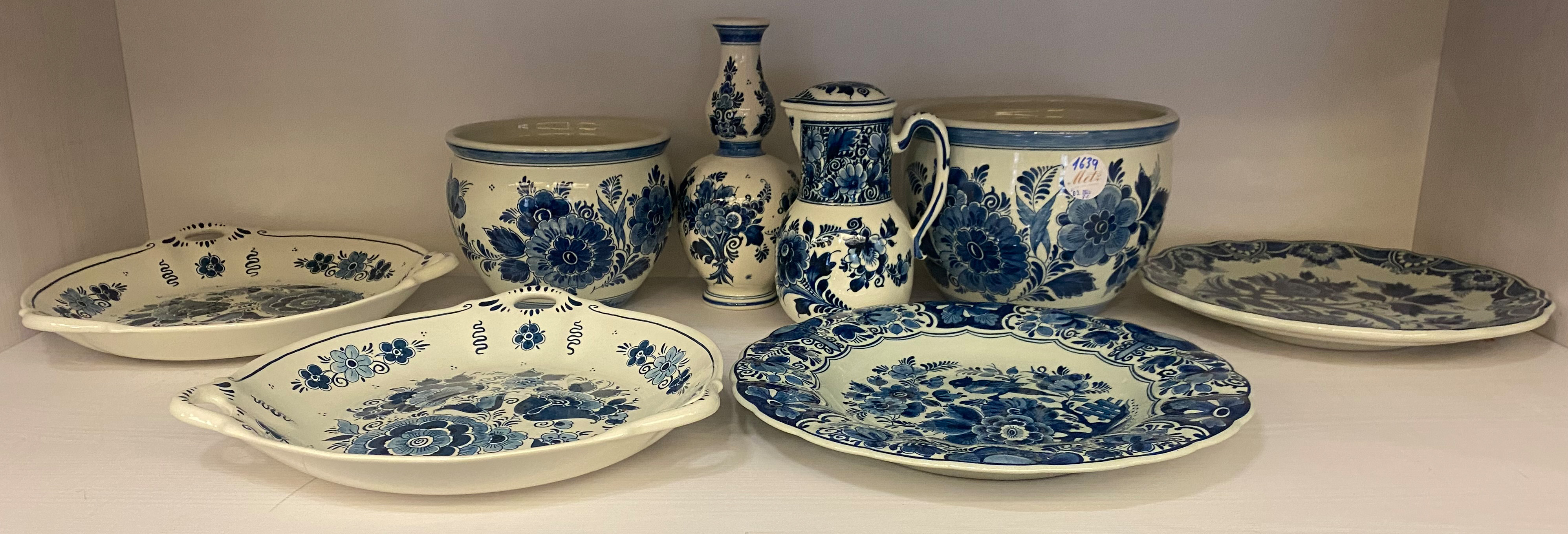 - Katalog-Nr: 1639Konvolut Delfter Keramik des 20. Jhs. Je blau bemalt mit Floraldekor; am Boden gemarkt. Bestehend aus: Zwei Cachepots, zwei Teller, zwei Platten, eine Vase und eine Kanne, H=5 bis 22 cm, D= 28,5 cm.o.L.